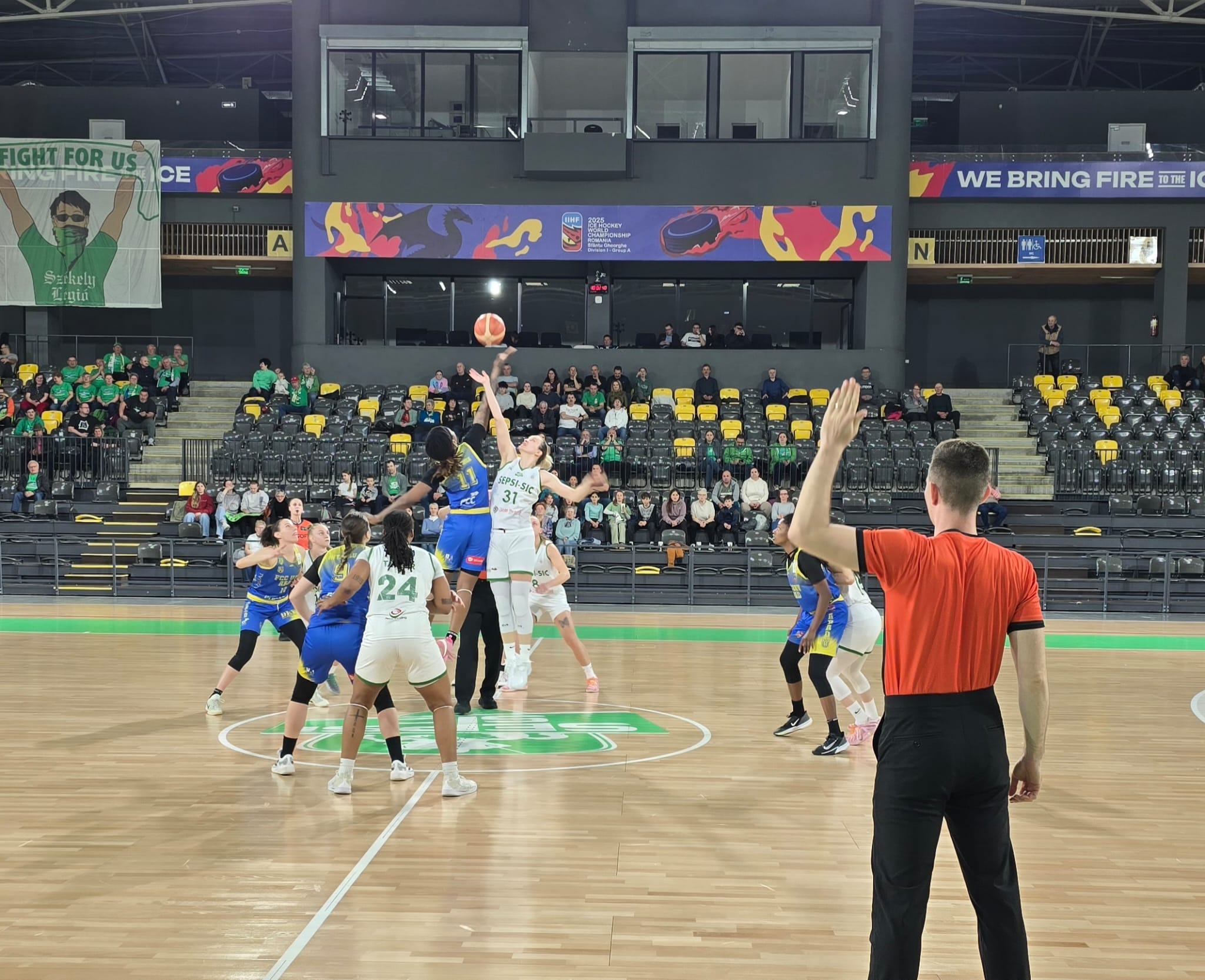 Tatiana Gallova a început partida cu 5-ul clasic, format din Rupnik, Fota, Redmond, Mititelu și Porchia. Gazdele, câștigătoarele sezonului regulat, au răspuns cu Cătinean, Armanu, Szabo, Taylor și Meresz. Cele două echipe au alternat la conducere în primul sfert, la capătul căruia tabela arăta 21-21.