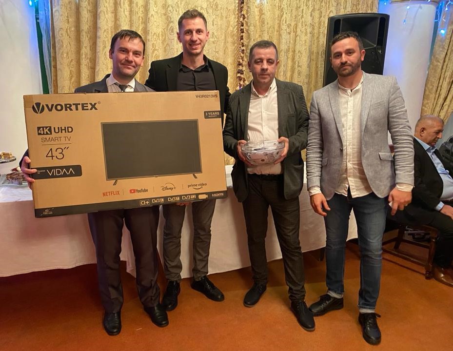 Poate cel mai aşteptat moment al Revelionului arbitrilor 2023 a fost cel al tombolei, fiind puse la bătaie peste 50 de premii. Chiar şi un reprezentant al delegaţiei de la AJF Bekescsaba – al cărui parteneriat de colaborare cu Comisia Judeţeană de Arbitri din cadrul AJF Arad a demarat în urmă cu 17 ani la iniţiativa lui Corneliu Tiulea – a câştigat două dintre premii. Cel mai norocos însă s-a dovedit a fi arbitrul-asistent Remus Naghi, care a avut biletul cu numărul 276, care i-a adus un televizor cu diagonala de 110 cm.