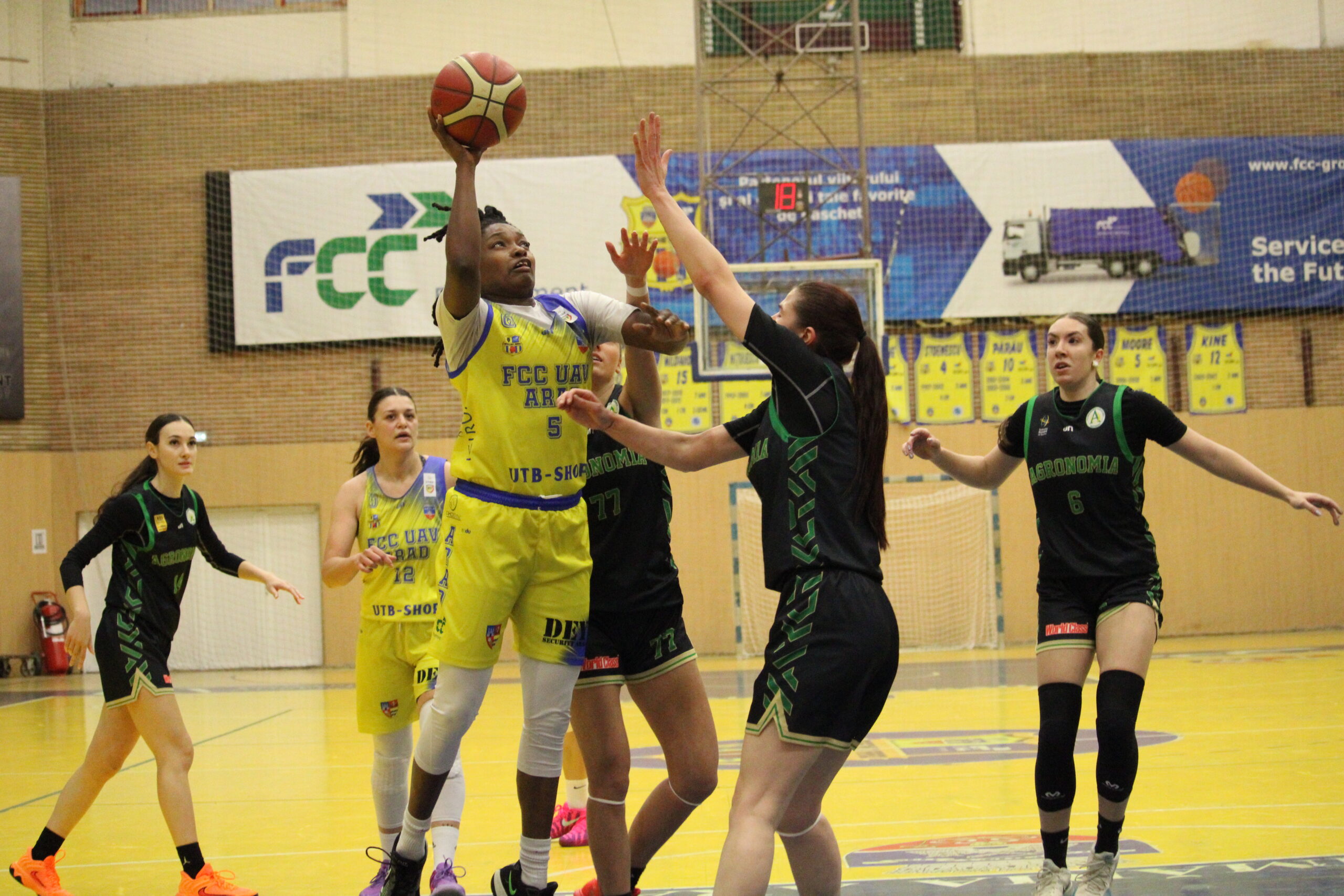 FCC Baschet UAV Arad a făcut spectacol cu Agronomia București, în etapa a 8-a a Ligii Naționale de Baschet Feminin. Arădencele s-au impus cu 104-33 acasă, pe sferturi 25-5, 28-1, 25-14, 26-13.