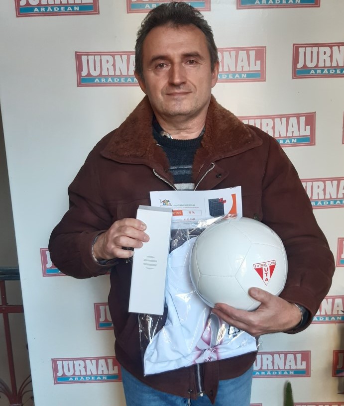 ARAD. Câştigătorul etapei cu numărul 6 a concursului „Scorul corect îţi aduce premii”, organizat de Jurnal arădean-Aradon pe perioada Campionatului Mondial de fotbal Qatar 2022, a intrat, luni, în posesia premiului. Este vorba despre Marius Iovici (55 de ani) din Arad, care a fost răsplătit cu o minge de fotbal, un tricou personalizat CM Qatar 2022, un bidon de apă, o boxă bluetouth şi un voucher de 5% reducere la achiziţia de panouri fotovoltaice de la Smart House.