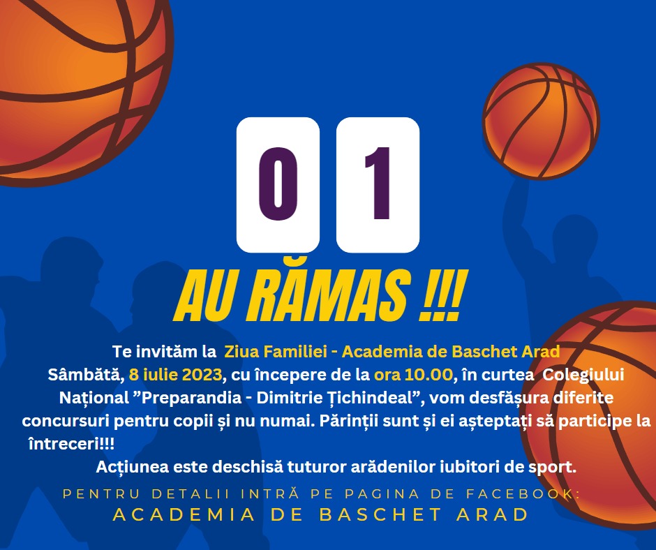 Sâmbătă, 8 iulie 2023, cu începere de la ora 10, în curtea Colegiului Național „Preparandia-Dimitrie Țichindeal”, va avea loc o interesantă acțiune sportivă, intitulată „Ziua familiei – Academia de baschet Arad”. Acțiunea este una de promovare a sportului în general, de petrecere a timpului în aer liber practicând mișcarea, dar cu accent pe ramura de sport baschet.