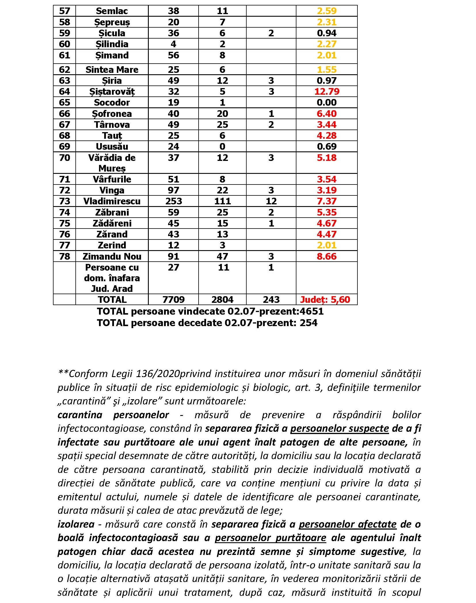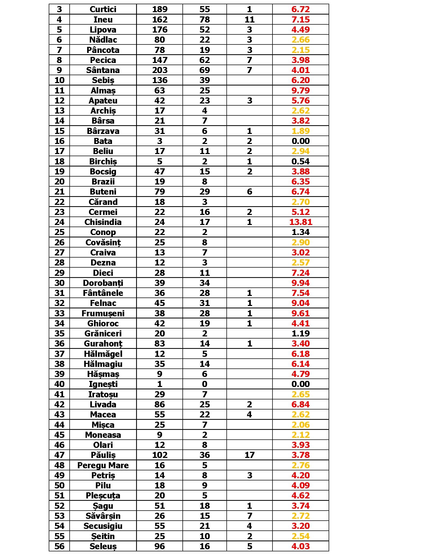 Cele mai ridicate incidențe se înregistrează la Chisindia – 13,81/mie, Șiștarovăț – 12,79/mie, Almaș – 9,79 la mie, Dorobanți – 9,94/mie, Felnac – 9,04/mie, Frumușeni – 9,61/mie. Municipiul se menține în continuare sub 8 cazuri la mia de locuitori – 7,81/1000.