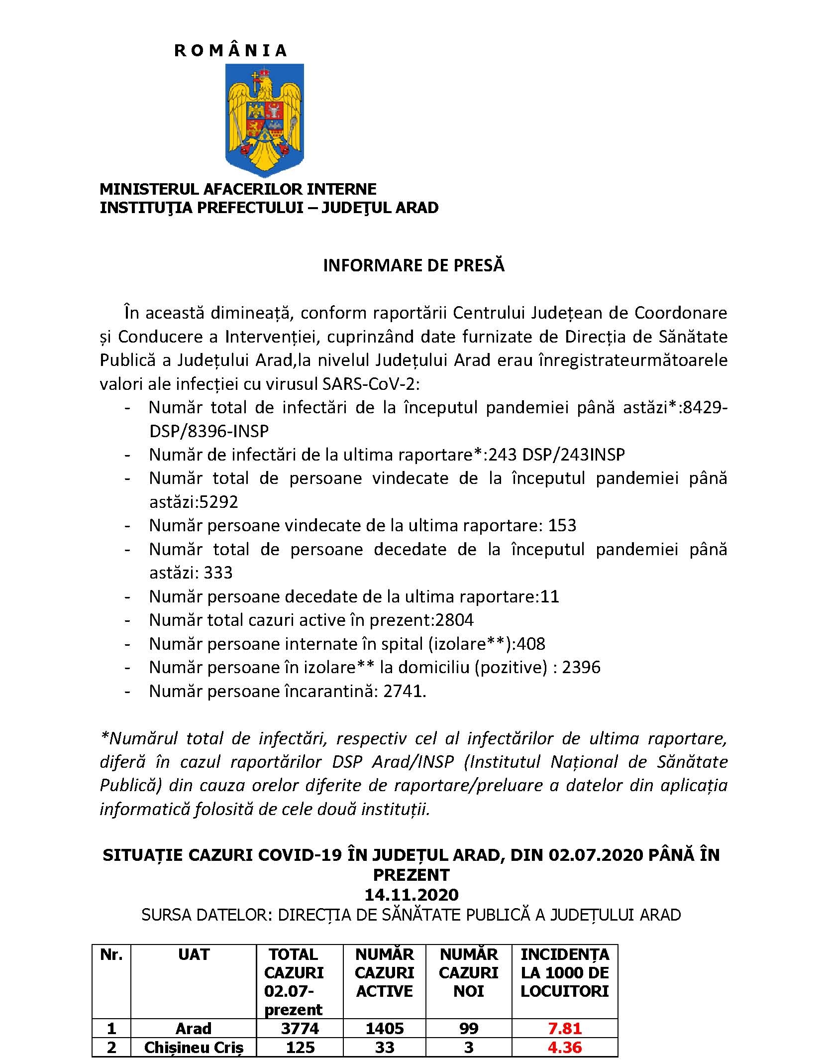 243 de cazuri noi de infecție cu SARS-CoV2, 133 de vindecări și 11 decese au fost înregistrate în decurs de 24 de ore, de vineri până sâmbătă, în județul Arad. Buletinul informativ transmis de Instituția Prefectului Județului Arad arată că 408 persoane sunt internate în Spitalul Clinic Județean de Urgență Arad și Spitalul Orășenesc Ineu, în timp ce 2.396 de persoane pozitive sunt în izolare la domiciliu. Incidența cumulată a cazurilor la nivel județean în ultimele 14 zile, la mia de locuitori, a ajuns în județul Arad la 5,6.