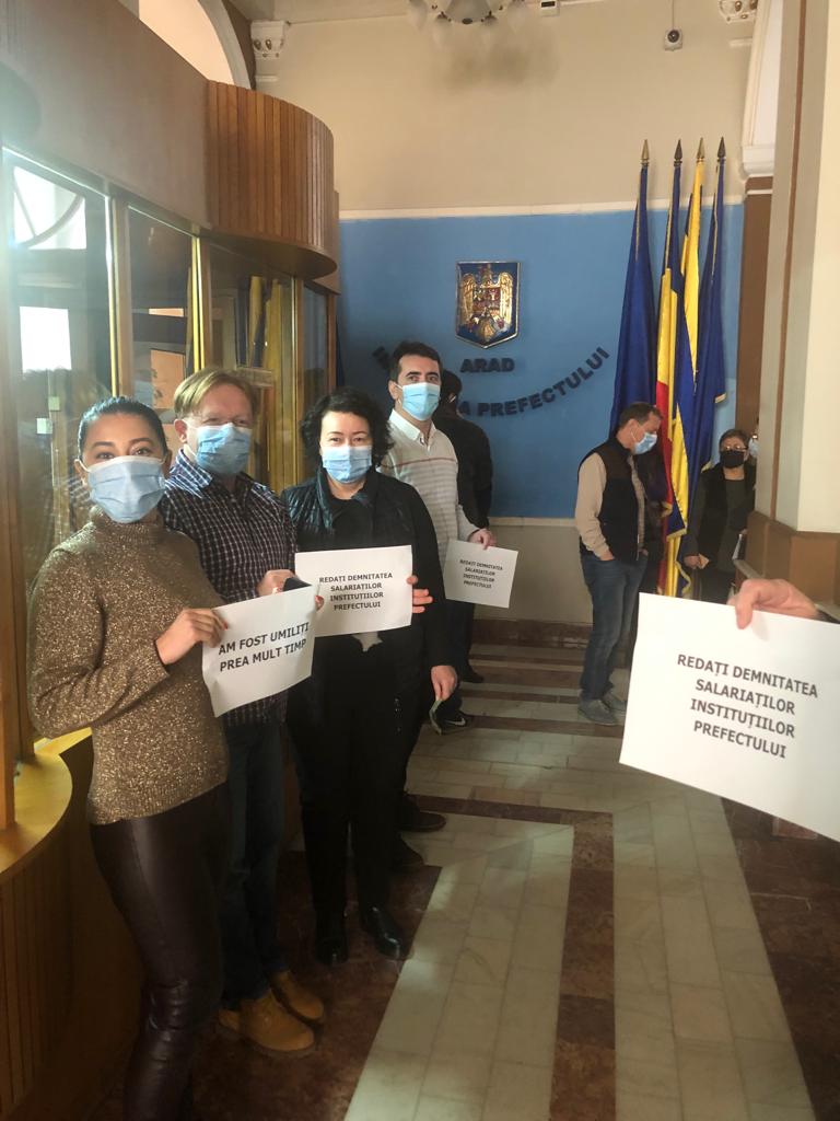 ARAD. În această dimineață, de la ora 10:00, aproximativ 30 de angajați ai Instituției Prefectului au întrerupt lucrul și se află în grevă de avertisment până la ora 11. Greva de avertisment a fost anunțată în urmă cu două zile de către Sindicatul Egalitatea al Funcţionarilor Publici şi Personalului Contractual din Administrația Publică, la care sunt afiliați și angajații Prefecturii Arad.