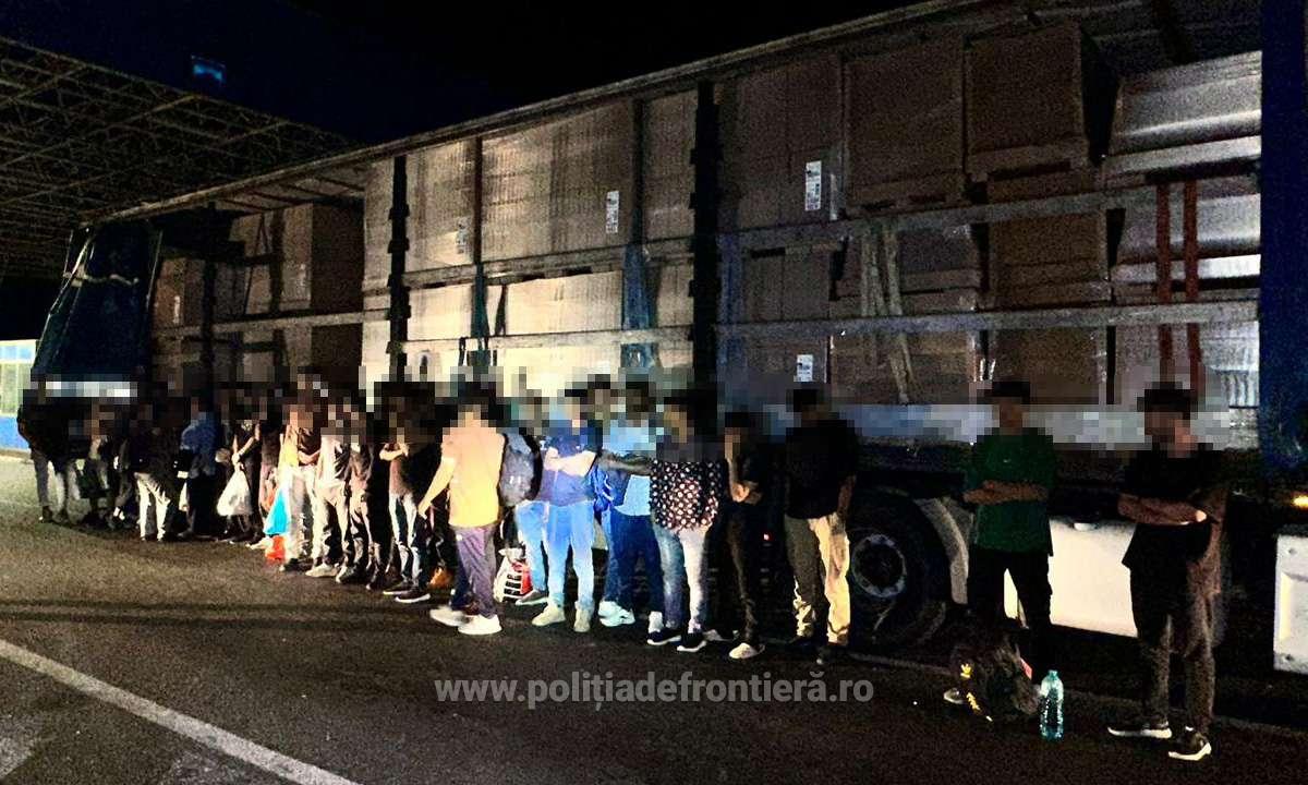 „În data de 16.08.2024, la Punctul de Trecere a Frontierei Nădlac II, județul Arad, s-a prezentat pentru efectuarea formalităţilor de frontieră, pe sensul de ieşire din ţară, un cetăţean român, la volanul unui ansamblu rutier înmatriculat în România. Bărbatul transporta, conform documentelor de însoțire a mărfii, mobilă pe ruta România – Italia. În baza profilului de risc s-a procedat la efectuarea unui control amănunțit al mijlocului de transport în urma căruia polițiștii de frontieră au descoperit, în compartimentul destinat transportului de marfă, 32 de cetățeni străini” – informează Poliţia de Frontieră.