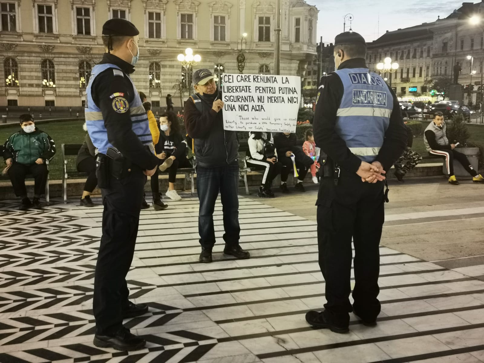 Extraordinara pancarta omului pozat in fata primariei: Cine renunta la libertate pentru putina siguranta nu va avea nici una nici alta!