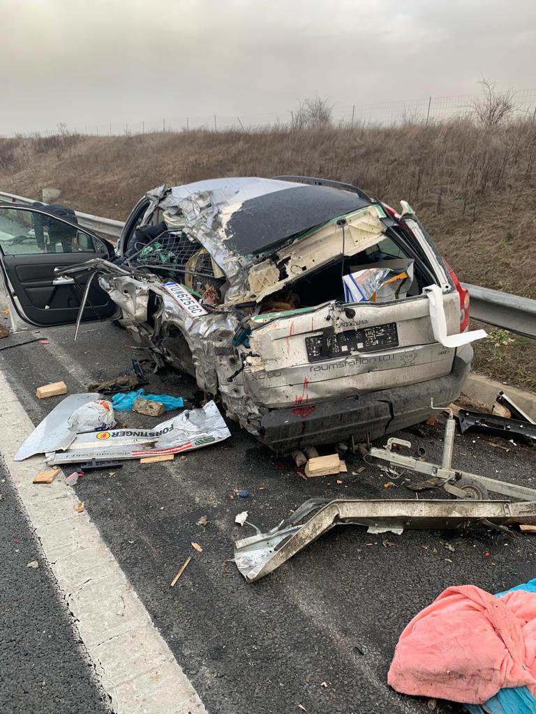 Dar, totusi, nu inteleg cum a intrat ala cu tirul ca taurul comunal in masina stationata pe banda de urgenta…?! Daca o masina este stationata de banda de urgenta si nu are o urgenta reala (desi in cazul asta avea), intri in ea, asa, ca idiotul? Se vad niste urme de franare foarte ciudate intr-o poza…