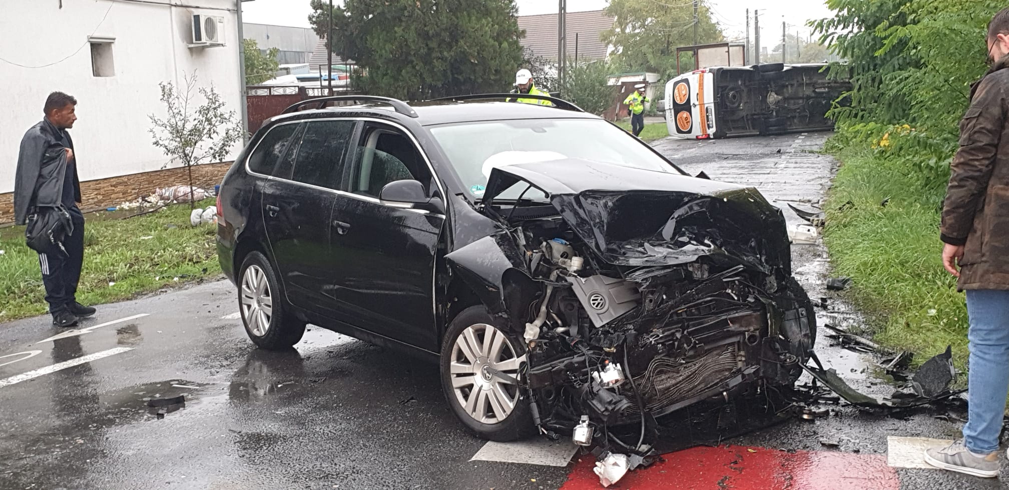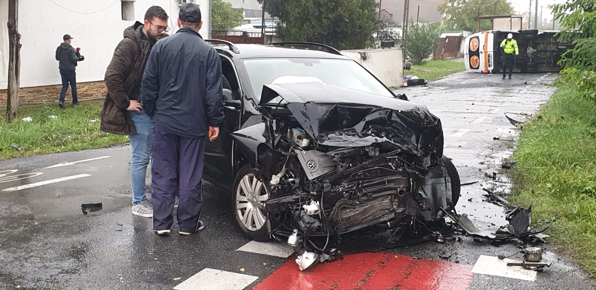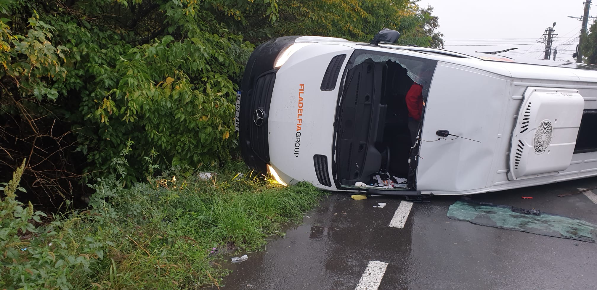 UPDATE: “În această dimineață, în jurul orei 07.15, a avut loc un accident rutier în municipiul Arad. Din cercetări a reieșit că un bărbat de 47 de ani, din localitatea Păuliș, care conducea un microbuz cu 23 de pasageri, pe strada Fântânii, la intersecția cu strada Bogdan Voievod, a intrat în coliziune cu un autoturism condus de o femeie de 48 de ani, din municipiul Arad, după care s-a răsturnat pe partea carosabilă. În urma impactului a rezultat rănirea ușoară a cinci pasageri care au fost transportați la spital, ceilalți fiind în stare stabilă. Conducătorii auto au fost testați cu aparatul etilotest rezultatul fiind negativ în ambele cazuri. În cauză a fost întocmit un dosar penal sub aspectul săvârșirii infracțiunii de vătămare corporală din culpă, polițiștii continuă cercetările pentru stabilirea tuturor cauzelor și împrejurărilor în care s-a produs accidentul”, informează IPJ Arad.