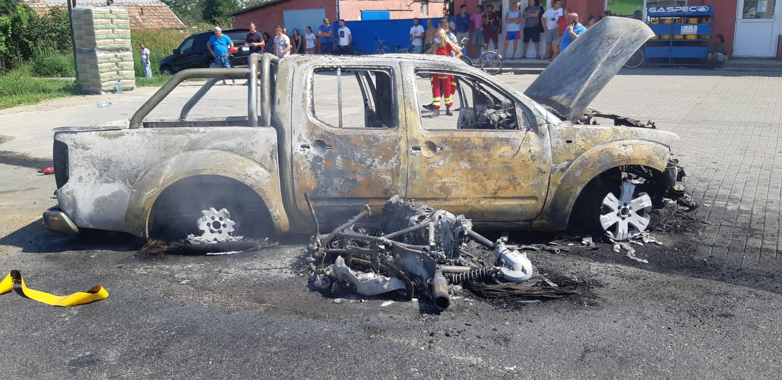 “Accidentul s-a produs între o motocicletă și un autoturism de teren. Apelul la 112 a fost efectuat în jurul orei 14:30. În momentul apelului au fost alertate forțele Detașamentului de Pompieri Arad, Serviciului de Ambulanța Județean Arad și Serviciului Voluntar pentru Situații de Urgență Felnac. Au intervenit două echipaje, unul de stingere, o autospecială SMURD Terapie Intensivă Mobilă, un echipaj SAJ și un alt echipaj de stingere de la SVSU Felnac. Apelantul a anunțat că atât autoturismul, cât și motocicleta au luat foc. În momentul sosirii echipajelor de intervenție, ambele ardeau generalizat. A fost găsită o victimă inconștientă, bărbat, 45 de ani, conducătorul motocicletei. Acesta, din păcate, nu a răspuns manevrelor de resuscitare fiind declarat decesul. Șoferul mașinii de teren nu este rănit. Atât autoturismul, cât și motocicleta au ars în totalitate”, au precizat reprezentanții Inspectoratului pentru Situații de Urgență Arad.