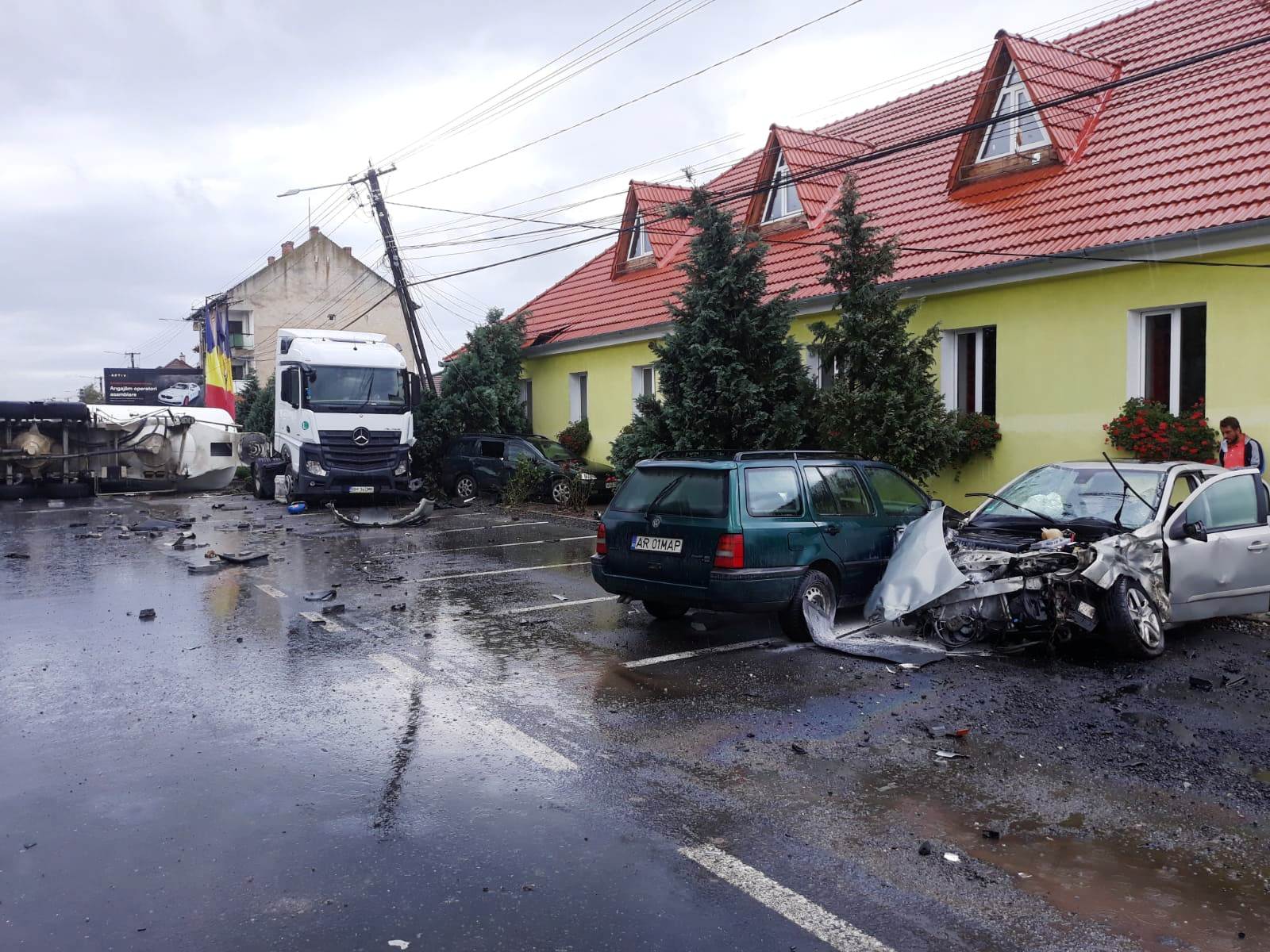 UPDATE 3: Polițiștii au stabilit cauzele și împrejurările în care s-a produs accidentul. Potrivit primelor cercetări s-a constatat că „astăzi, în jurul orei 12:00, o femeie de 36 de ani, din Arad, în timp ce conducea un autoturism dinspre Zărand înspre Ineu, la intersecția cu DJ 792 nu a respectat semnificația indicatorului «oprire». Autoturismul a pătruns în intersecție, unde a intrat în coliziune cu un ansamblu format din autoutilitară și semiremorcă, condus de un bărbat de 44 de ani, din județul Bihor. În urma impactului, ansamblul a intrat în derapaj, intrând în coliziune cu trei autovehicule parcate în fața primăriei localității Seleuș. Evenimentul rutier s-a soldat cu rănirea ușoară a conducătoarei auto și a doi copii minori, de 3 și 5 ani, pasageri pe bancheta din spate a autoturismului. Victimele au fost transportate la spital în vederea acordării de îngrijiri medicale. În urma testării cu aparatul etilotest, rezultatul a fost zero în ambele cazuri. În cauză se continuă cercetările sub aspectul săvârșirii infracțiunii de vătămare corporală din culpă”.