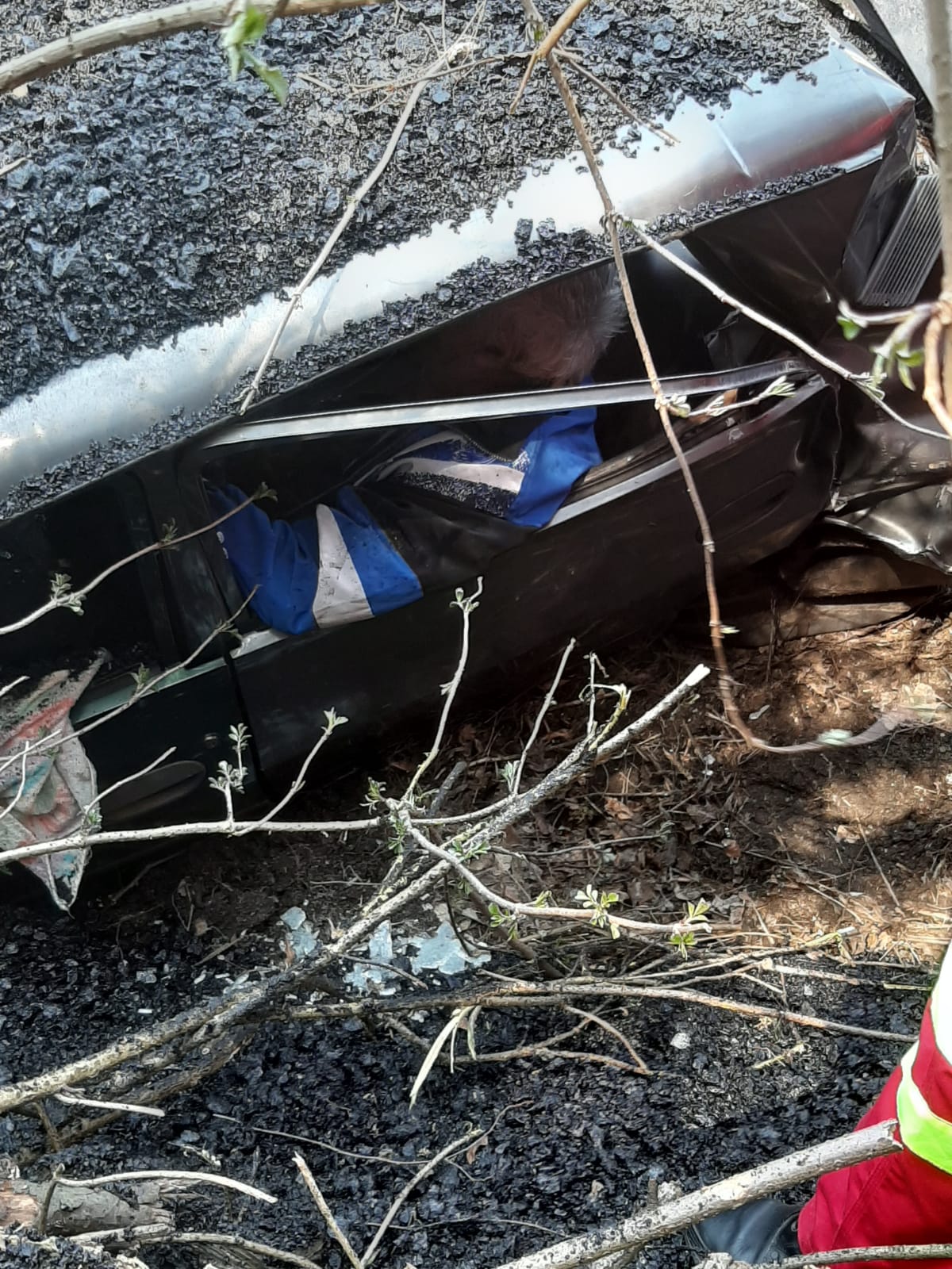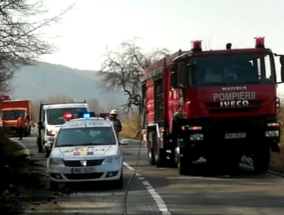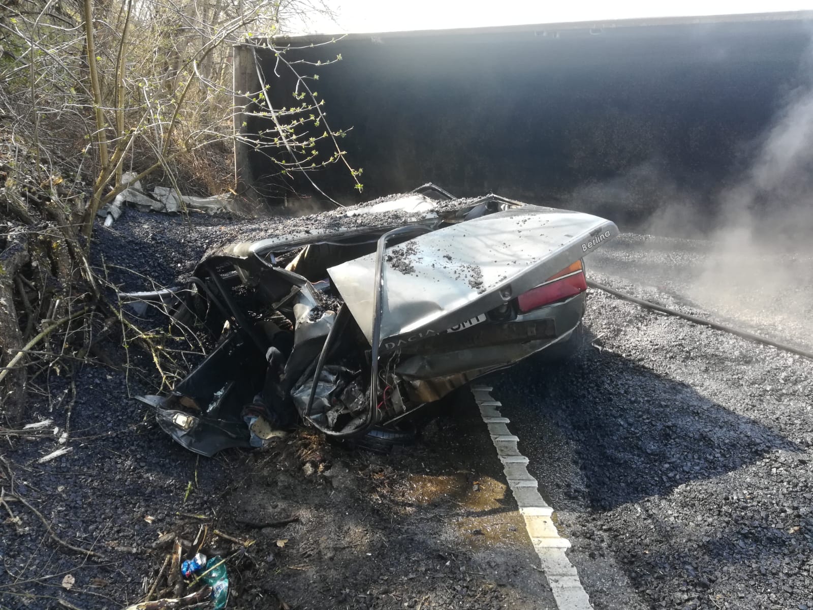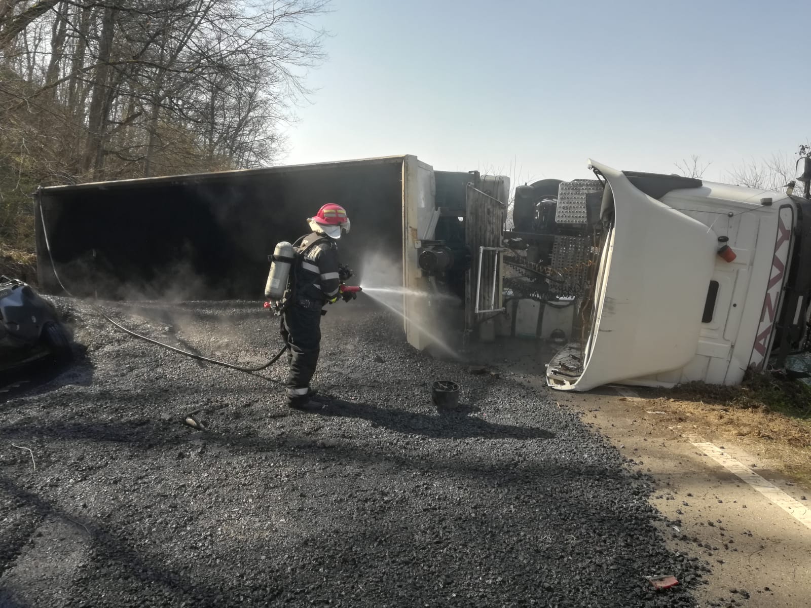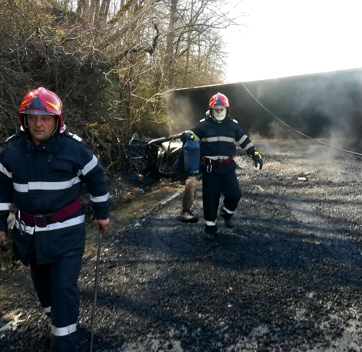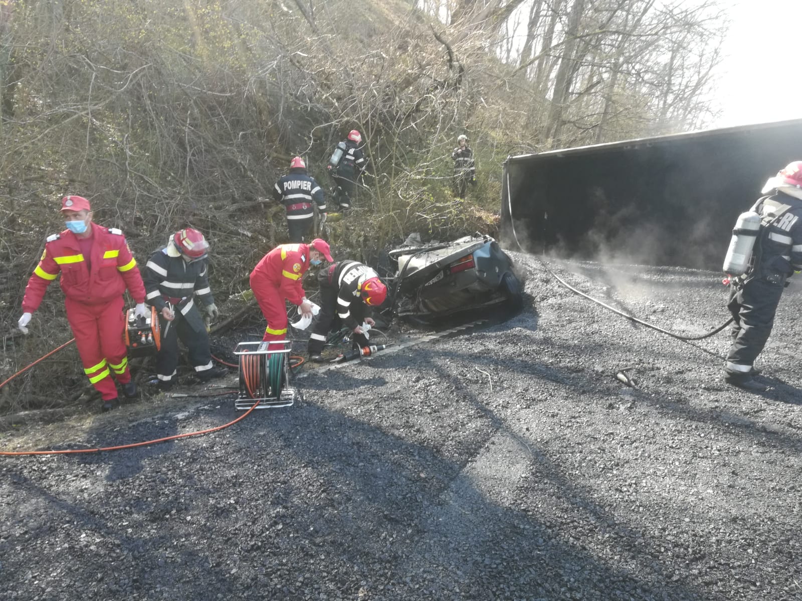 UPDATE: Pompierii au reușit să extragă persoana rămasă încarcerată în autoturism. Aceasta este în viață, conștientă, însă a suferit arsuri pe membrele inferioare din cauza bitumului fierbinte care s-a scurs pe mașină.