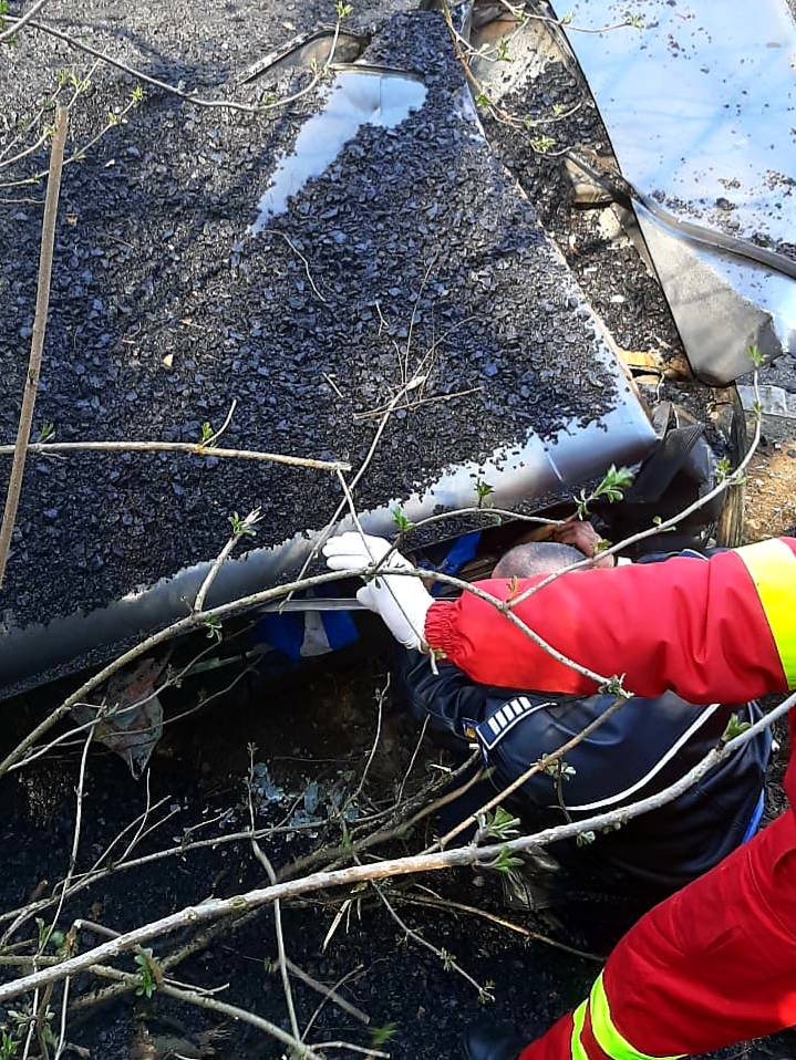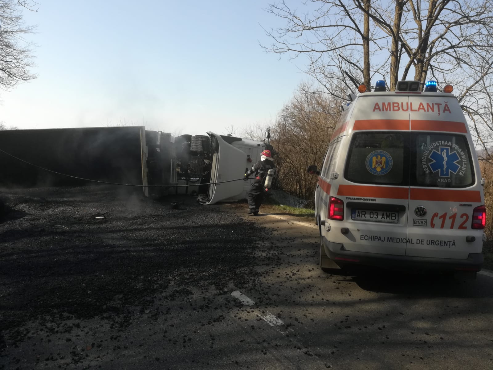 Un bărbat de 71 de ani care se afla într-un autoturism a rămas încarcerat în urma accidentului. Și asta după ce încărcătura camionului s-a răsturnat pe mașina septuagenarului. Pompierii au intervenit pentru scoaterea șoferului mașinii și, în paralel, pentru răcirea bitumului fierbinte scurs și pe șosea. Inspectoratul pentru Situații de Urgență Arad a intervenit la fața locului cu două autospeciale de stingere: pompierii de pe prima autospecială au acționat pentru răcirea bitumului fierbinte scurs pe carosabil, iar celălalt echipaj pentru descarcerarea persoanei. La locul accidentului au mai sosit un echipaj al Serviciului de Ambulanță Județean Arad, un echipaj SMURD, precum și elicopterul SMURD. Pompierii au reușit să extragă persoana rămasă încarcerată în autoturism. Aceasta este în viață, conștientă, însă a suferit arsuri din cauza bitumului fierbinte care s-a scurs pe mașină.