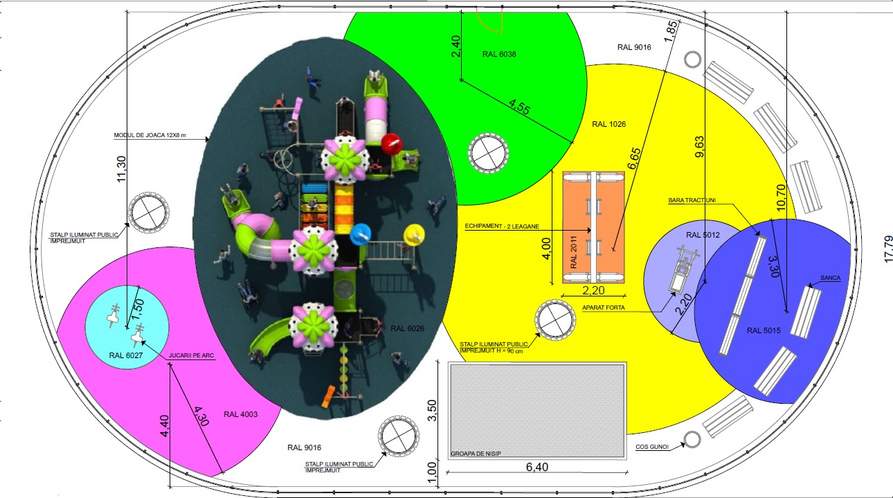 Pentru amenajarea locului de joacă, se vor executa următoarele intervenţii: *dezafectarea locului de joacă existent – împrejmuire, echipamente deteriorate, bănci, coşuri de gunoi; *pregătirea terenului – decopertarea straturilor de pământ de la 35 cm până la realizarea cotelor de săpătură de unde începe realizarea straturilor structurii de rezistenţă a infrastructurii (20 cm balast, 10 cm piatră spartă împănată, 4 cm BA 8 mixtură asfaltică); finisajul va fi cu covor de cauciuc turnat în 8 culori diferite; *realizarea canalizării și a rigolelor pentru colectarea apelor pluviale; *realizarea fundaţiilor pentru împrejmuirea terenului cu o înălțime de 1,5 m.