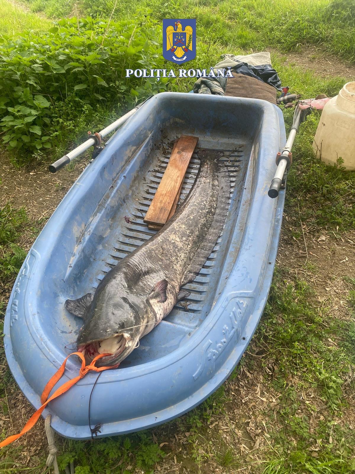 Bărbatul avea într-o barcă un exemplar din specia somn, de aproximativ 40 de kilograme, care ar fi fost pescuit la pripon, metodă interzisă prin lege. Exemplarul a fost eliberat în mediul său natural, iar bărbatul a fost sancționat contravențional cu amendă în valoare de 10.000 de lei.