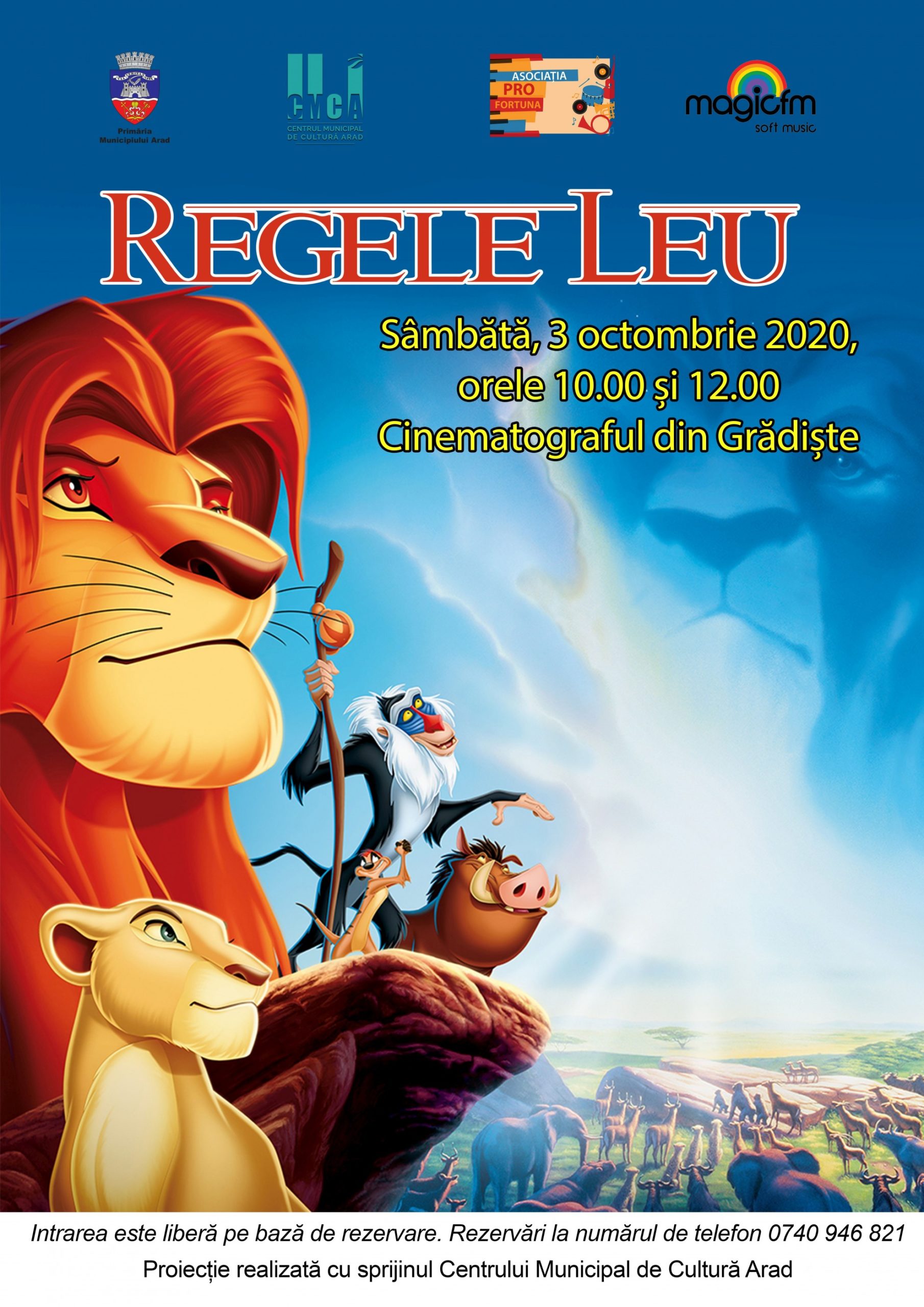 „Regele Leu” va rula pe 3 octombrie, de la orele 10 și 12, în sala de cinema din Grădiște, de pe calea Petru Rareș. Considerat unul dintre cele mai bune filme de animație din toate timpurile, „Regele Leu” va rula dublat în limba română.