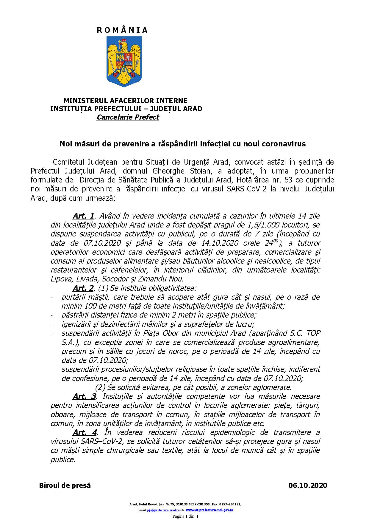 De asemenea, pe o perioadă de 7 zile se suspendă activitatea tuturor operatorilor economici care desfăşoară activităţi de preparare, comercializare şi consum al produselor alimentare şi/sau băuturilor alcoolice şi nealcoolice, de tipul restaurantelor şi cafenelelor, în interiorul clădirilor, din următoarele localități: Lipova, Livada, Socodor și Zimandu Nou.