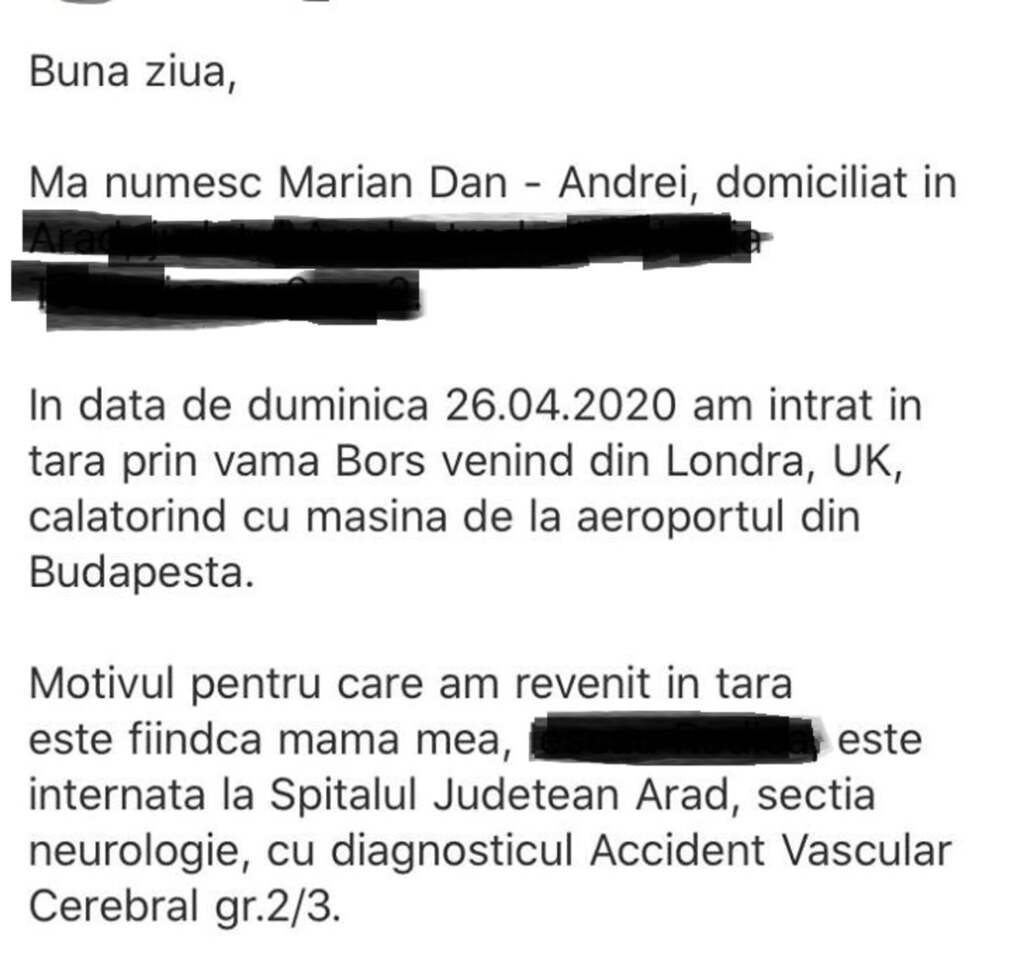 Imediat, Andrei a început căutările pentru a găsi un avion care să-l aducă cât mai aproape de Arad, lucru deloc ușor în aceste vremuri. Și a găsit unul – care a aterizat sâmbătă pe aeroportul din Budapesta. Apoi, cu un microbuz a fost adus, alături de alți pasageri, până la vama Borș, unde s-a efectuat controlul de frontieră. De aici a fost transportat într-un centru de carantină, la Curtici. Andrei a putut să plece atât de repede din Marea Britanie în baza unei „învoiri” emisă de Ambasada României în UK, care justifică călătoria arădeanului pe timpul pandemiei de COVID-19 în baza situatiei familiale. Evident că nu a avut parte de nicio derogare la intrarea în România, de altfel actul eliberat de ambasadă nu avea o astfel de putere, iar tânărul a ajuns în carantină, la Curtici. Din nefericire, mama sa a decedat în această dimineață.