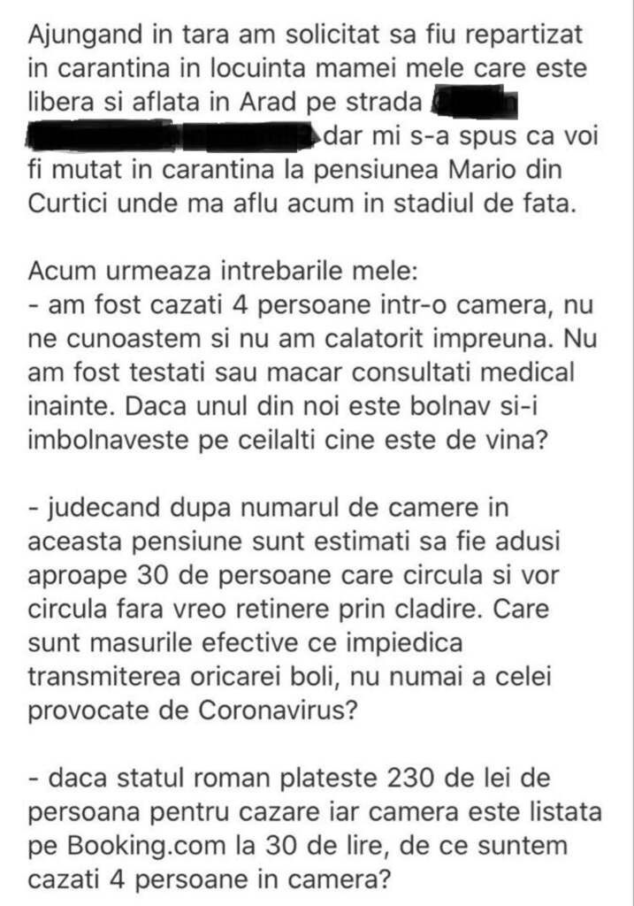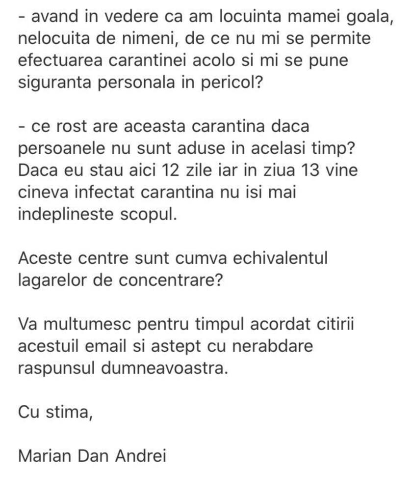 În reclamație, Andrei a scris: „Am fost cazate 4 persoane într-o cameră, nu ne cunoaștem și nu am călătorit împreună. Nu am fost testați sau măcar consultați medical înainte. Dacă unul dintre noi este bolnav și îi îmbolnăvește pe ceilalți cine este de vină? Judecând după numărul mare de camere sunt estimați să fie aduși aproape 30 de oameni care circulă și vor circula fără vreo reținere prin clădire. Care sunt măsurile efective ce împiedică transmiterea oricărei boli, nu numai a celei provocate de coronavirus? Dacă statul român plătește 230 de lei de persoana pentru cazare, iar camera este listată pe booking.com la 30 de lire, de ce suntem cazate 4 persoane în cameră? Având în vedere că am locuința mamei goală, nelocuită de nimeni, de ce nu mi se permite efectuarea carantinei acolo și mi se pune siguranța personală în pericol? Ce rost are această carantină dacă persoanele nu sunt aduse în același timp? Dacă eu stau aici 12 zile, iar în ziua 13 vine cineva infectat, carantina nu își mai îndeplinește scopul. Aceste centre sunt cumva echivalentul lagărelor de concentrare?”.