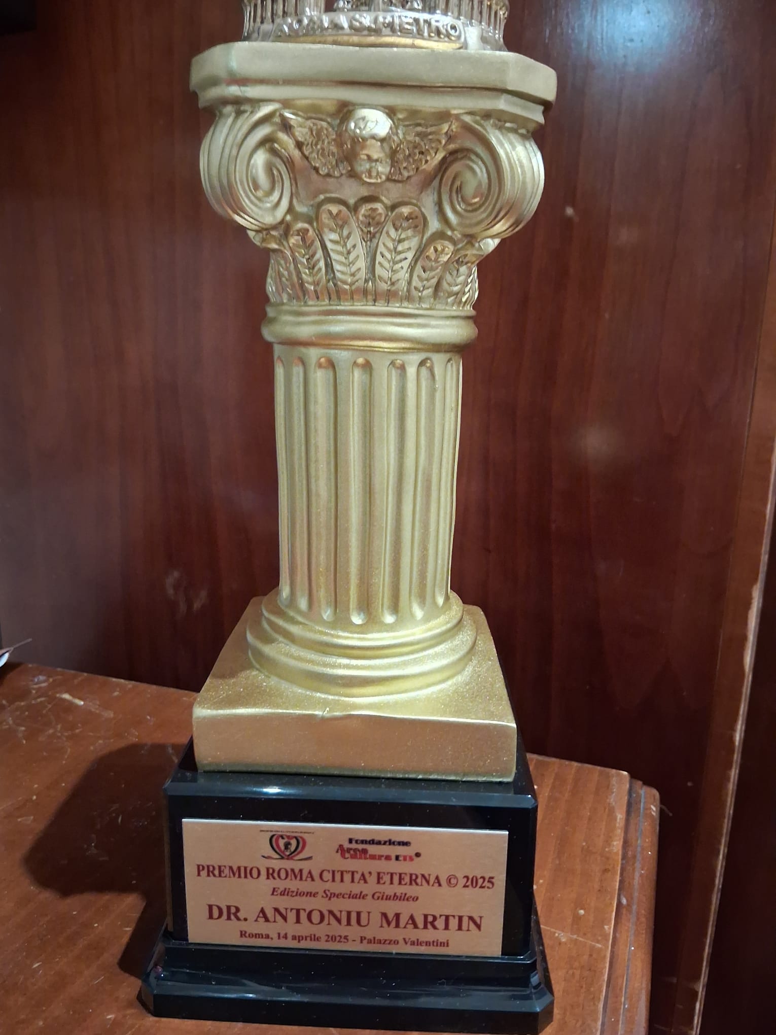 Un alt premiu care mă onorează a fost distincția acordată la Vatican, pe 26 aprilie, chiar în ziua funeraliilor Papei Francesco. Este vorba despre ,,Artigiani di Speranza”, primită din partea Academiei Pontificale de Teologie a Sfântului Scaun. S-a considerat că articolele mele au promovat valori fundamentale ale vieții, precum credința și demnitatea umană. Desigur că un astfel de premiu, conferit la Vatican, mă înnobilează spiritual. Faptul că decanul cardinalilor Francesco Coccopalmerio și președintele Academiei Pontificale de Teologie, monseniorul Antonio Stagliano, au fost cei care mi-au înmânat premiul a dat o și mai mare însemnătate și emoție momentului.