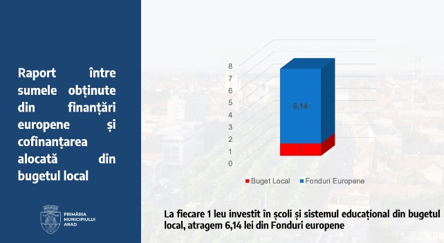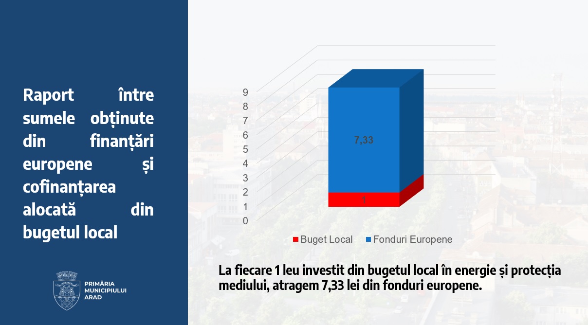 C.B: Ca să nu mai vorbim în procente, care pot părea pentru mulți neconcludente, am să vă arăt o altă perspectivă, mai simplă și mai pe înțelesul tuturor. Și am să exemplific prin câteva capitole din investiții. Astfel, la fiecare 1 leu investit din bugetul local în școli, primim gratis 6,14 lei din fonduri europene. Mai departe, la fiecare 1 leu investit din bugetul local în energie și protecția mediului, primim gratis 7,33 lei din fonduri europene. Cred că așa e mai ușor de înțeles pentru cei nespecializați și cred totodată că e și mai edificator pentru cât de mult înseamnă pentru noi accesarea de fonduri europene.