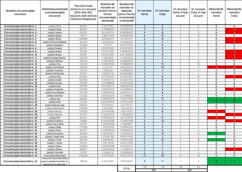 Potrivit celor de la gandul.info, pentru a ilustra impactul propunerii, USR a realizat o simulare a actualei legislaturi, conform datelor statistice de la 1 ianuarie 2024. Rezultatele arată că anumitor circumscripții li s-ar aloca mandate suplimentare, după cum urmează: circumscripția 43 – Diaspora: 10 mandate în plus (trei senatori și șapte deputați); circumscripția nr. 24 – Iași: trei mandate în plus (un senator și doi deputați); circumscripția nr. 25 – Ilfov: trei mandate în plus (un senator și doi deputați); circumscripția nr. 35 – Suceava: un mandat de senator în plus; circumscripția nr. 37 – Timiș: un mandat de senator în plus.