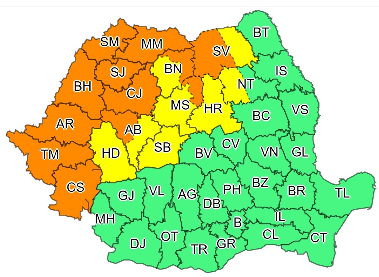 Potrivit meteorologilor, în județele Caraș-Severin, Timiș, Arad, Bihor, Satu Mare, Maramureș, Sălaj, Cluj și zonele de munte ale județelor Alba, Bistrița Năsăud, Mureș și Suceava, vor fi averse torențiale. Local cantitățile de apă vor fi de 30…40 l/mp și izolat de peste 50 l/mp (în intervale scurte de timp, de până la 1 – 3 ore).