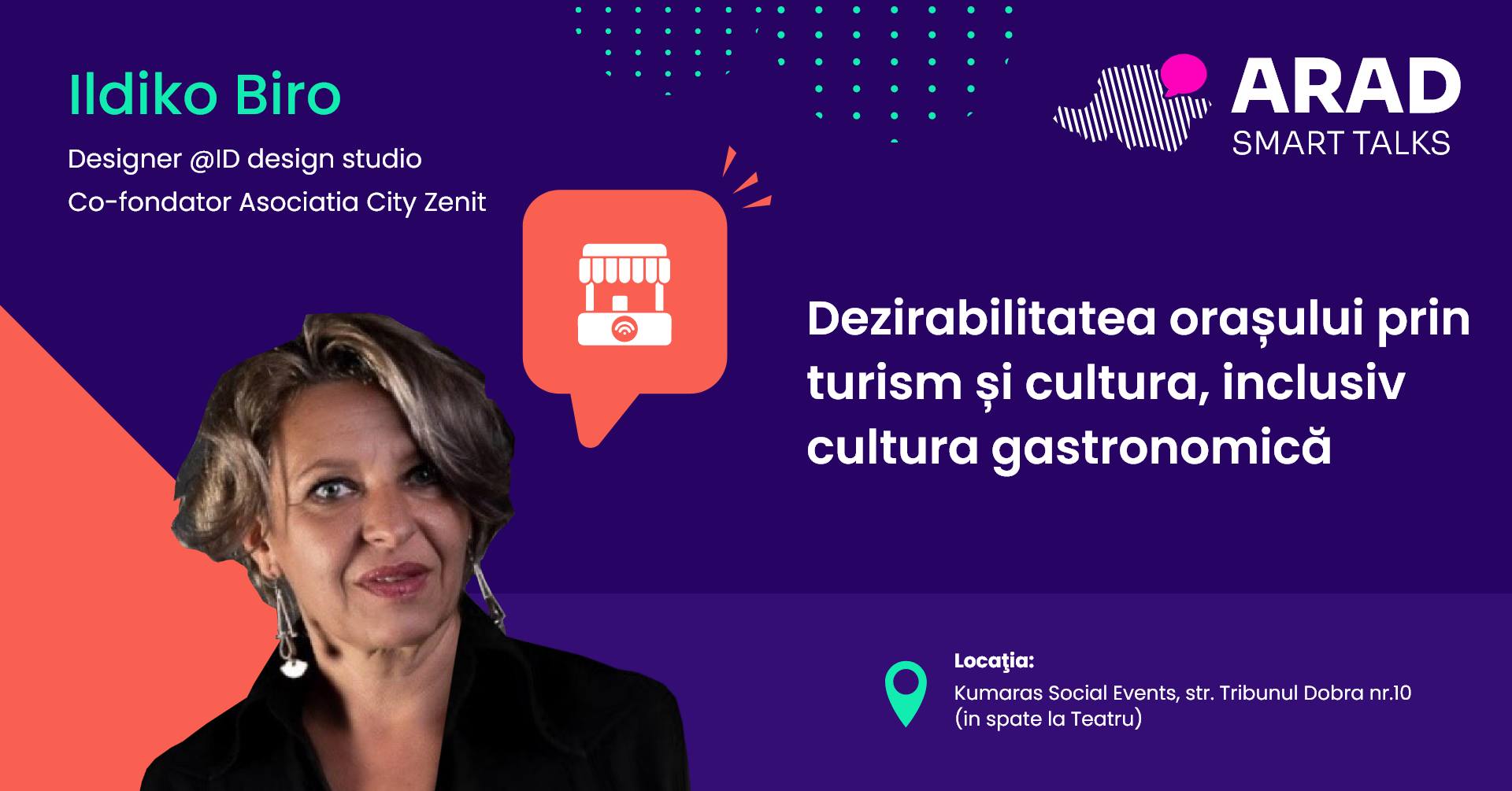 Prima conferință va fi susținută de Ildiko Biro, designer @ID design studio și co-fondator al Asociației CityZenit. Conferința cu tema „Dezirabilitatea orașului prin turism și cultură, inclusiv cultură gastronomică” se va desfășura pe 19 mai de la ora 18:00 (locația tuturor conferințelor fiind Kumaras Social Events – strada Tribunul Dobra, nr. 10) și va fi moderată de Olimpia Besliu – avocat și Carmen Schmidt – manager proiect.