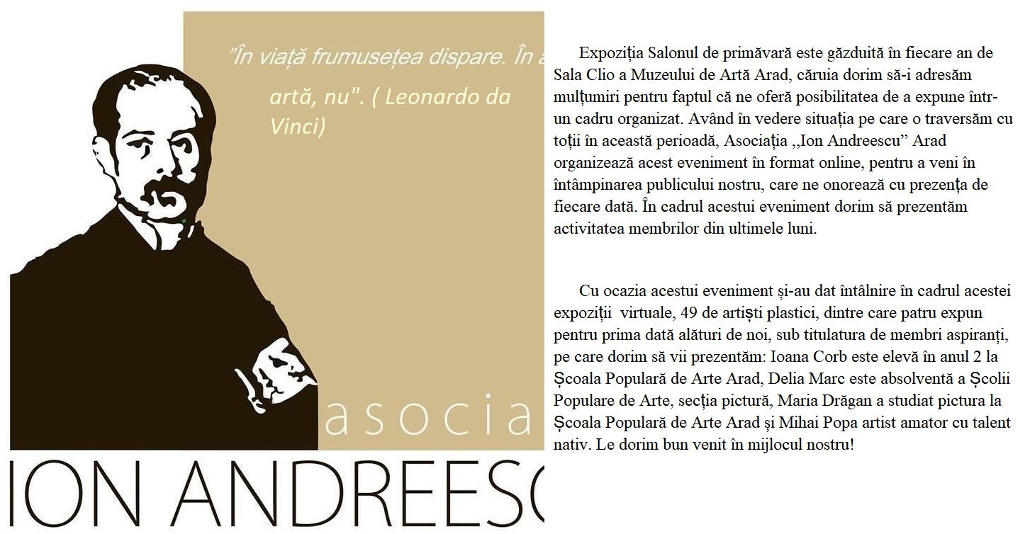 Expoziția “Salonul de primăvară” era programată anul acesta cu începere din data de 7 aprilie și până în 19 aprilie, în Sala Clio a Muzeului de Artă Arad, dar din motive evidente ale situației actuale, s-a mutat în mediul online.