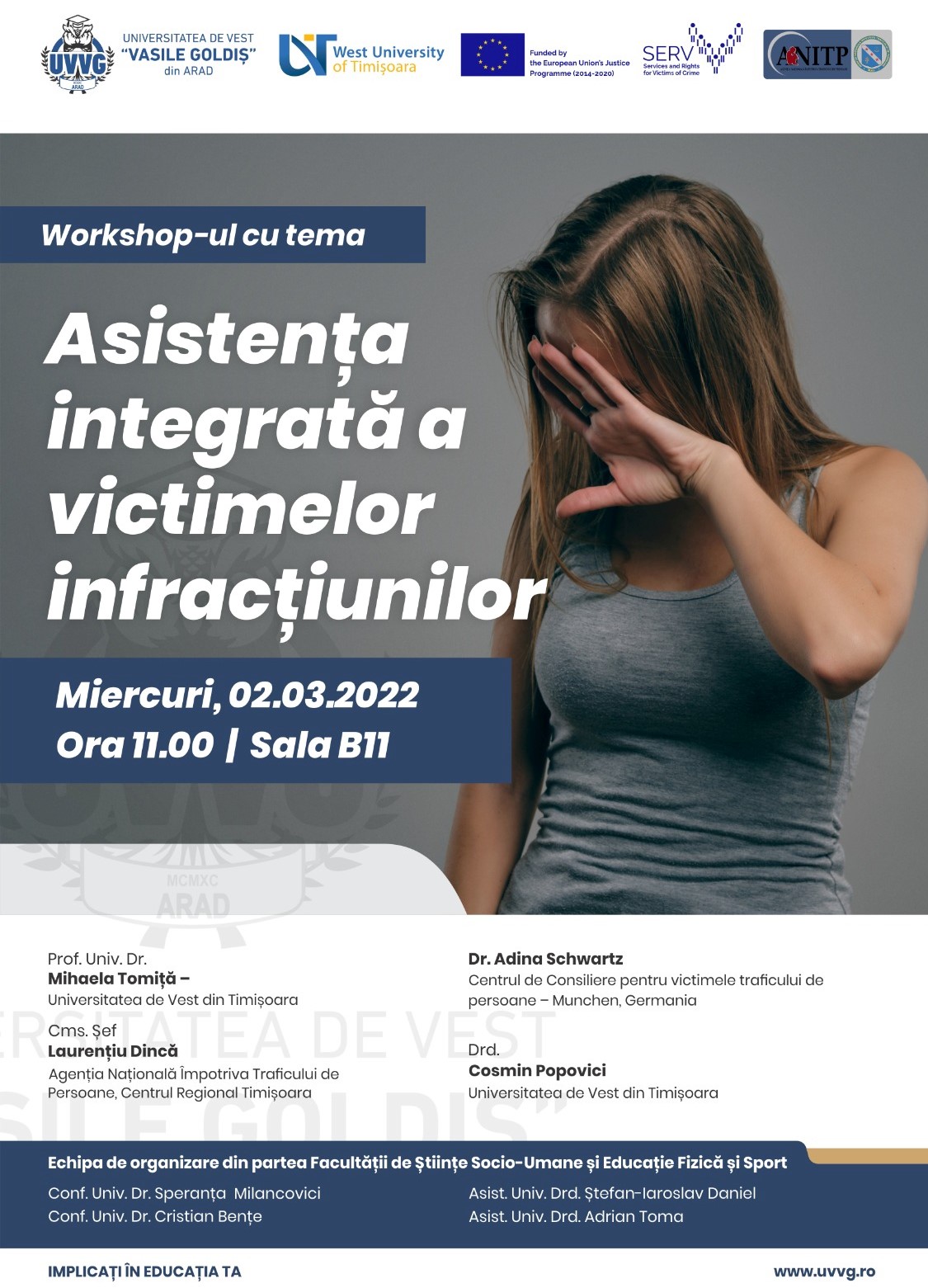Invitaţii speciali ai workshop-ului au fost: dr. Adina Schwartz – Centrul de Consiliere pentru victimele traficului de persoane, Munchen (Germania), cea care a oferit, prin mijlocirea facultății, training de specialitate polițiștilor locali arădeni, în anul 2019, evenimentul de-acum reprezentând o continuare firească a acestui tip de informare și pregătire; cms. şef Laurențiu Dincă – Agenția Națională Împotriva Traficului de Persoane, Centrul Regional Timișoara; prof. univ. dr. Mihaela Tomiță şi asist. univ. drd. Cosmin Popovici, din partea Universităţii de Vest din Timișoara.