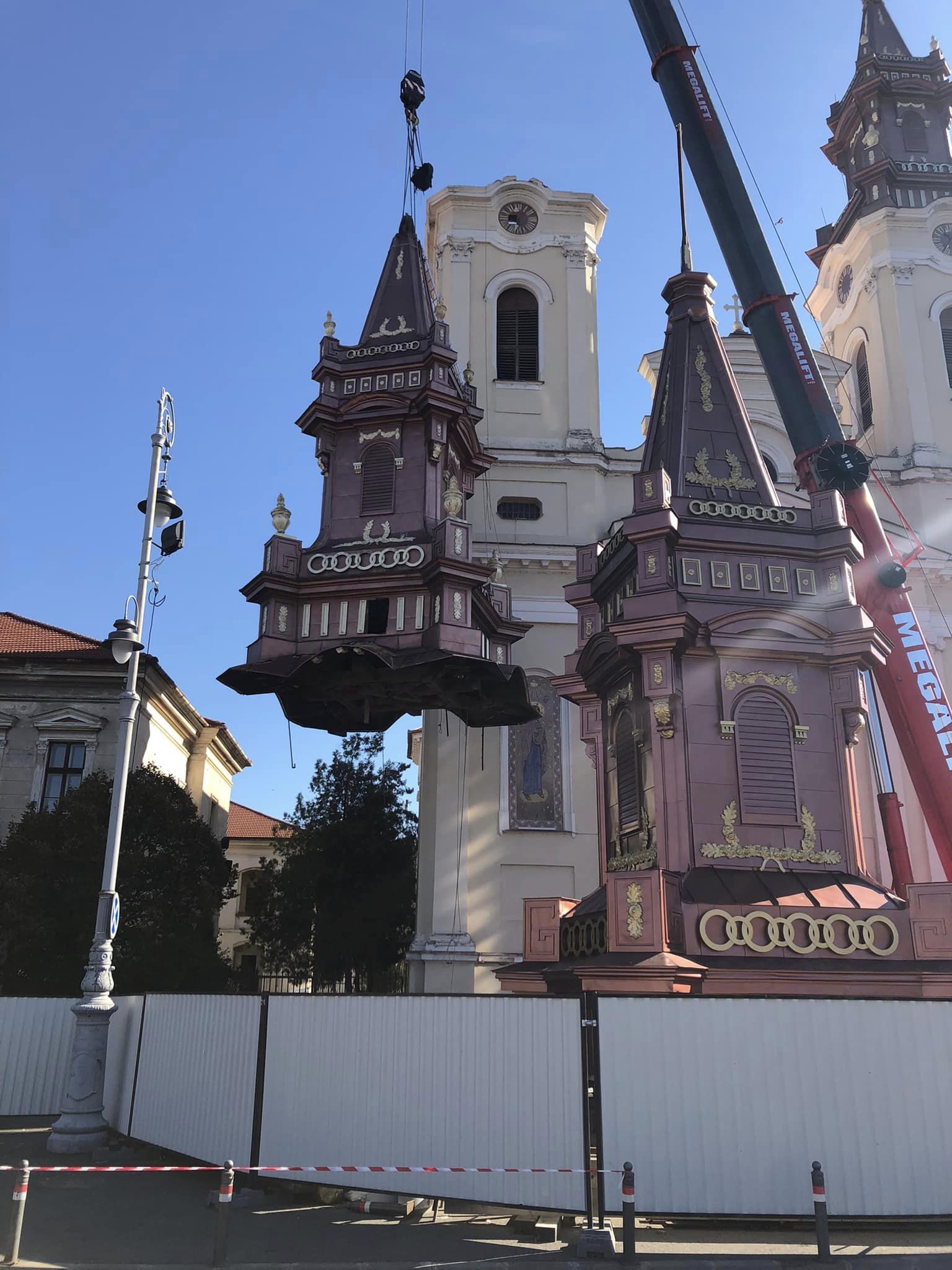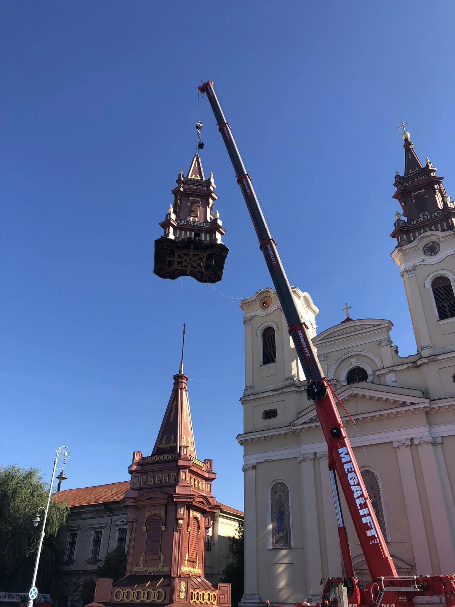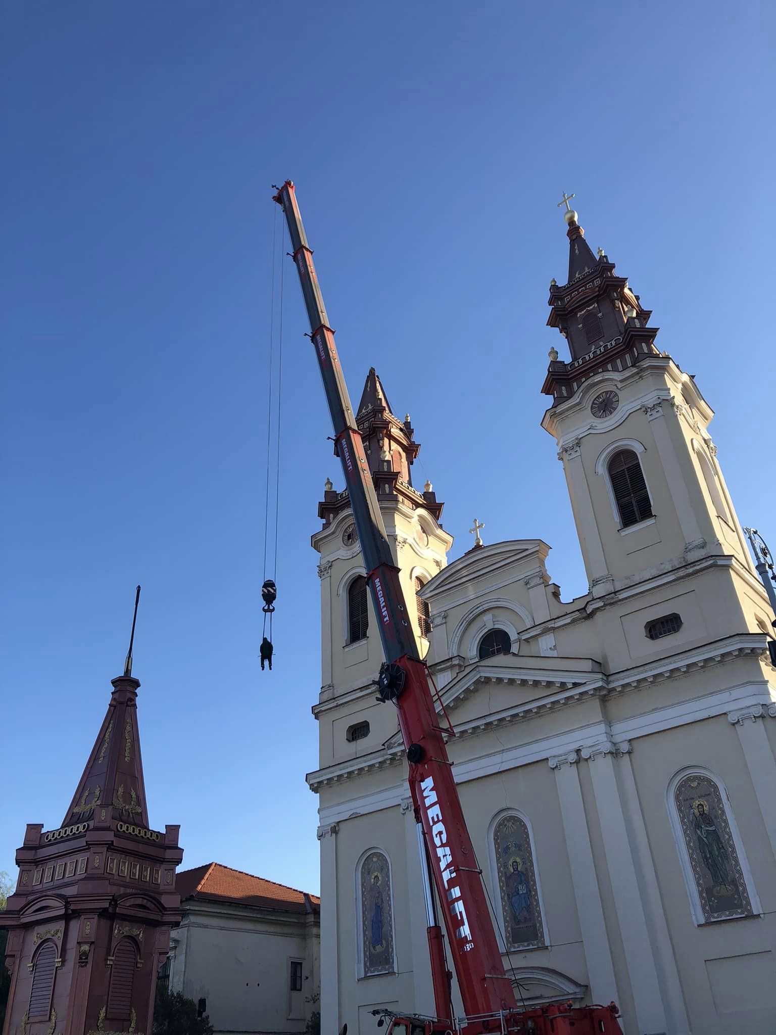 Ieri, încă de dimineață, Piața Catedralei era dominată de macaraua imensă care a făcut rocada între turele bisericii, spectacolul ingineresc fiind admirat atât de vânzătorii din piața pe cale de dispariție, cât și de trecători.