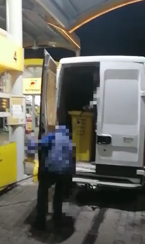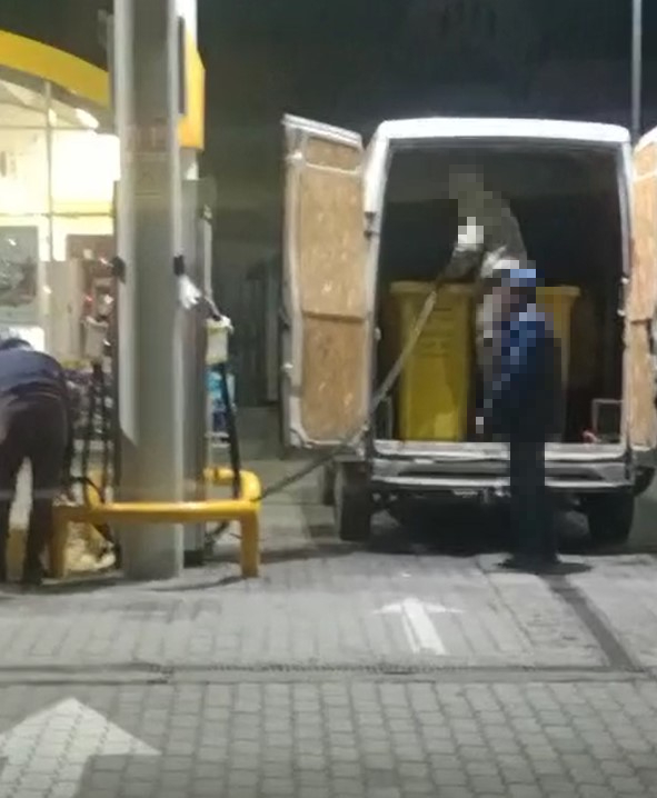 Păi e permis așa ceva? Să pui în pubele sau altfel de recipiente? Parcă sunt niște norme de siguranță pentru combustibil… Presupun că acea benzinărie este închisă deja și toată lumea sancționată.