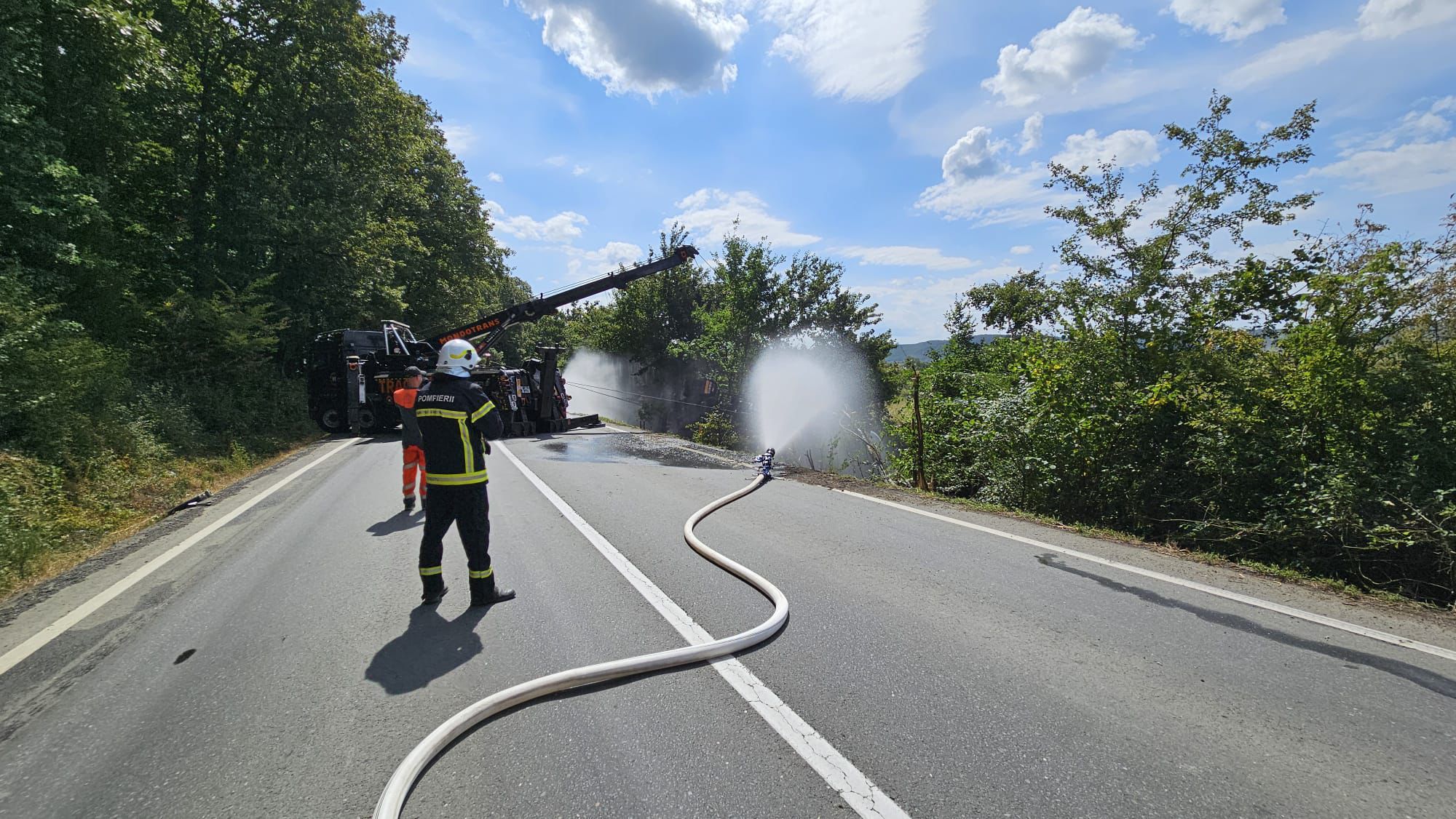 UPDATE 2. Împreună cu reprezentanții Gărzii de Mediu a fost luată decizia deversării substanței pe sol. “Menționăm că solul va fi depoluat de către reprezentanții societății comerciale în a cărei gestiune se află autocisterna, imediat după finalizarea intervenției” – spun cei de la ISU.
