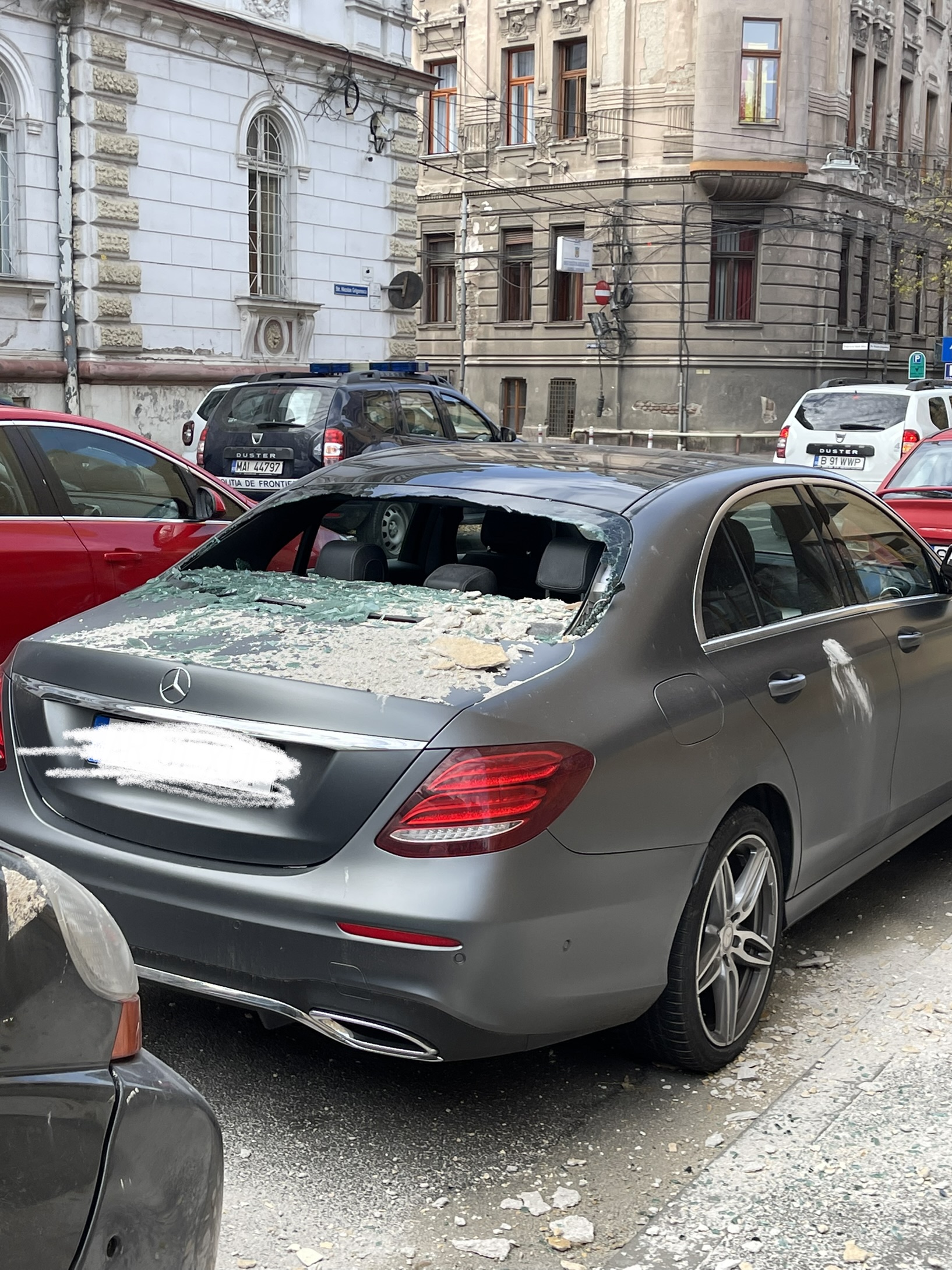 Din analiza vizuala a pozei care am facut-o, ( ca nespecialist, dar, cu multa exigenta ) nu cred ca acel geam se putea sparge, facandu-se tandari la o masina de genul acela, spun acest lucru din urmatoarele motive: 1 distanta de la zidul cladirii, chiar si al balconului este destul de mare cat sa cada perpendicular pe masina. 2 cantitatea de moloz care se vede cazuta. calitatea parbrizului, este totusi un mecedes model mai nou.