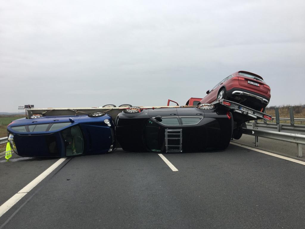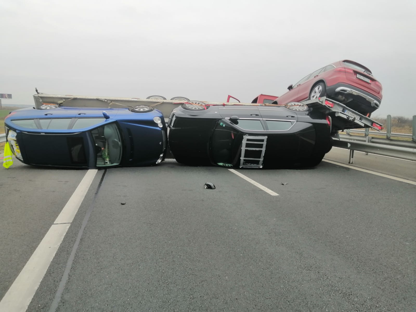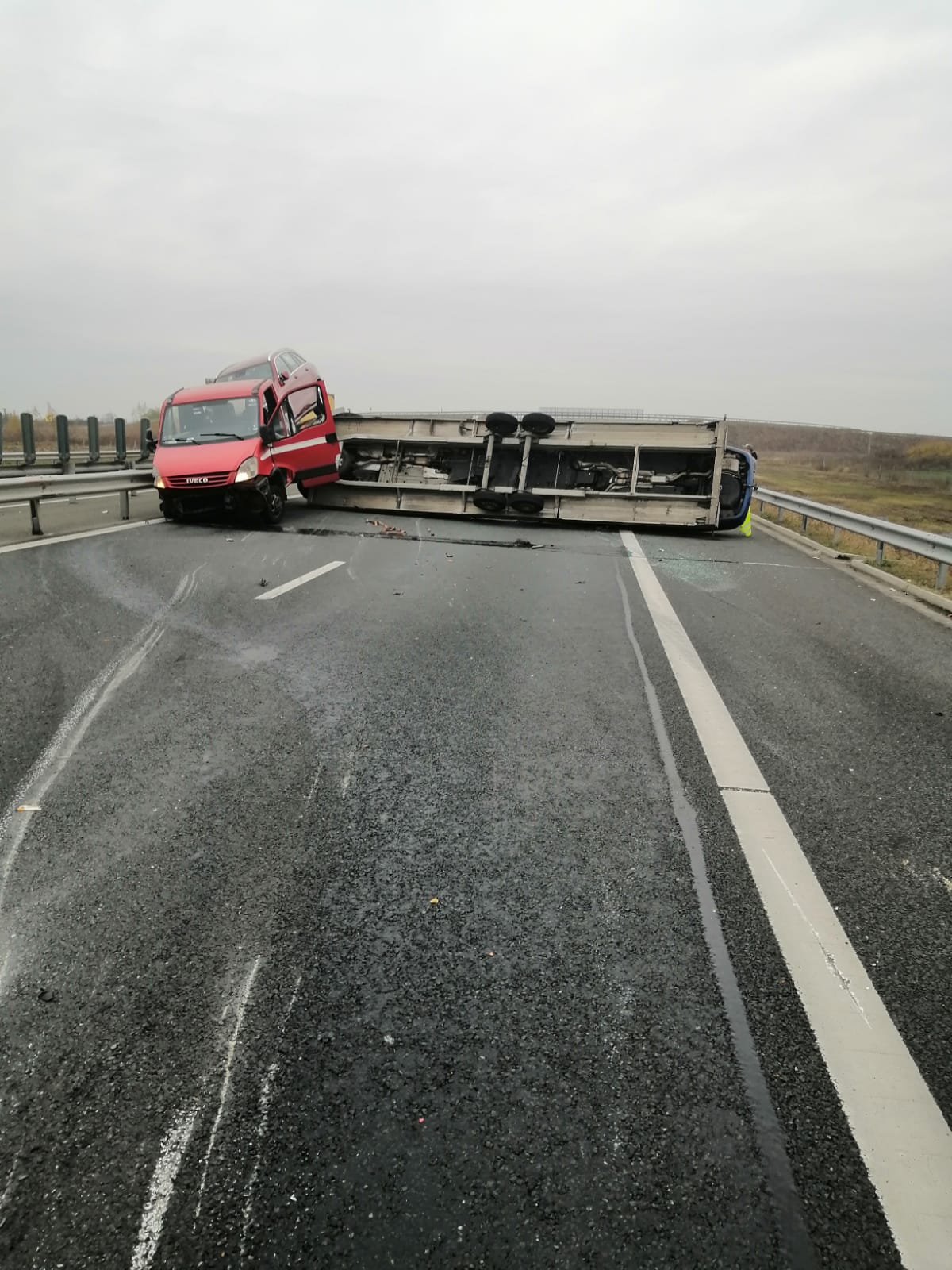 Traficul rutier a fost blocat pe autostrada Arad-Nădlac, vineri dimineața, după ce o autoutilitară cu platformă, înmatriculată în Bulgaria, care transporta trei autoturisme, s-a răsturnat pe sensul de mers Nădlac spre Arad al autostrăzii A1. Momentan, circulația se desfășoară pe banda de urgență.