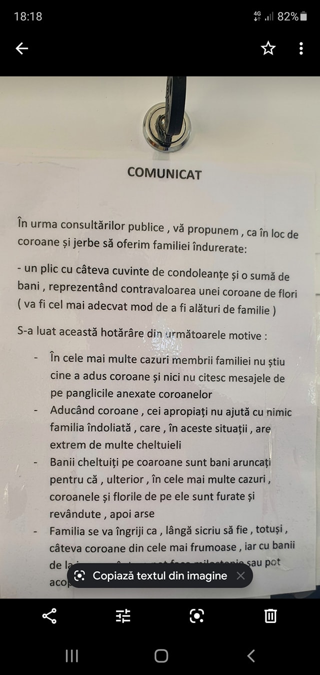 „Asta nu înseamnă că sunt interzise coroanele, doar că vrem să nu mai ajungem în postura de a arunca sute de coroane. Recomandăm ca doar familia să aducă coroane, iar ceilalți să pună un plic cu bani și câteva cuvinte adresate familiei. Nu mai facem motivării ale deciziei pentru că aproape toți cu cei cu care am vorbit au spus că este o idee bună. Un plic cu câteva cuvinte de condoleanțe și o sumă de bani reprezentând contravaloarea unei coroane va fi cel mai adecvat mod de a fi alături de familie”, așa sună postarea de pe pagina de Facebook a Primăriei Ghioroc, semnată de către primarul Corneliu Popi Morodan.