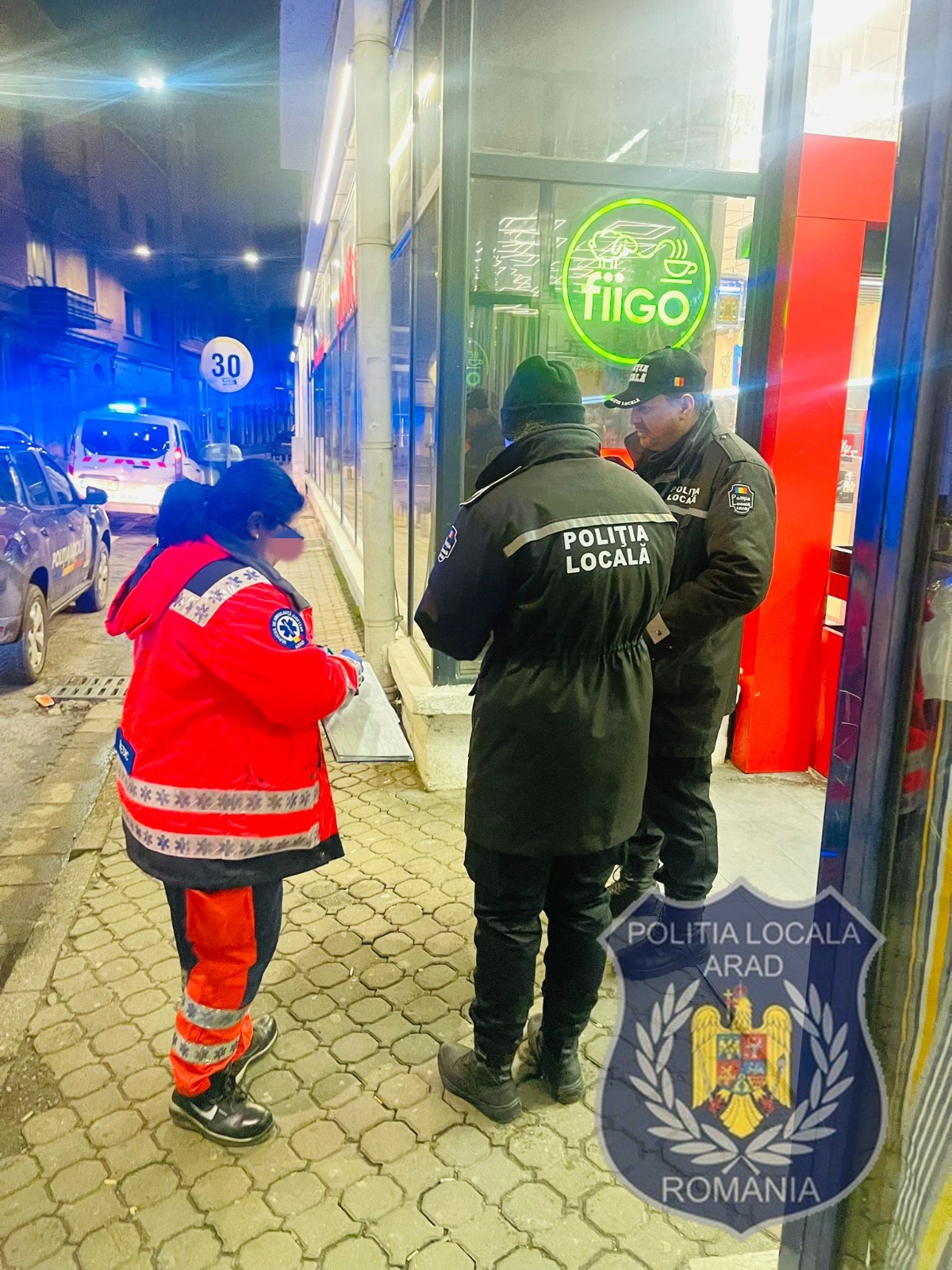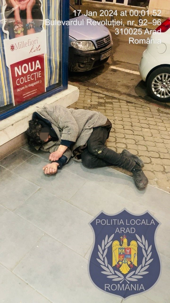 În data de 17.01.2024, în miez de noapte, polițiștii locali au găsit pe stradă și condus la Unitatea Primire Urgențe din cadrul Spitalului Clinic Județean de Urgență Arad, o persoană fără adăpost inconștientă, care ar fi putut rămâne expusă la îngheț până în zori.