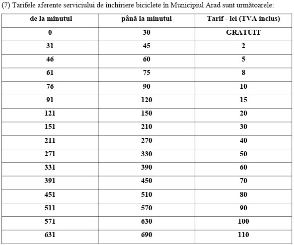 Consilierii locali municipali au aprobat Regulamentul de utilizare a sistemului de închiriere biciclete (bike-sharing) în regim self-service, în muncipiul Arad. De asemenea, a fost aprobat și Studiul de oportunitate pentru fundamentarea și stabilirea soluțiilor optime de delegare a gestiunii, organizare, exploatare funcționare și administrare a sistemului de bike-sharing.