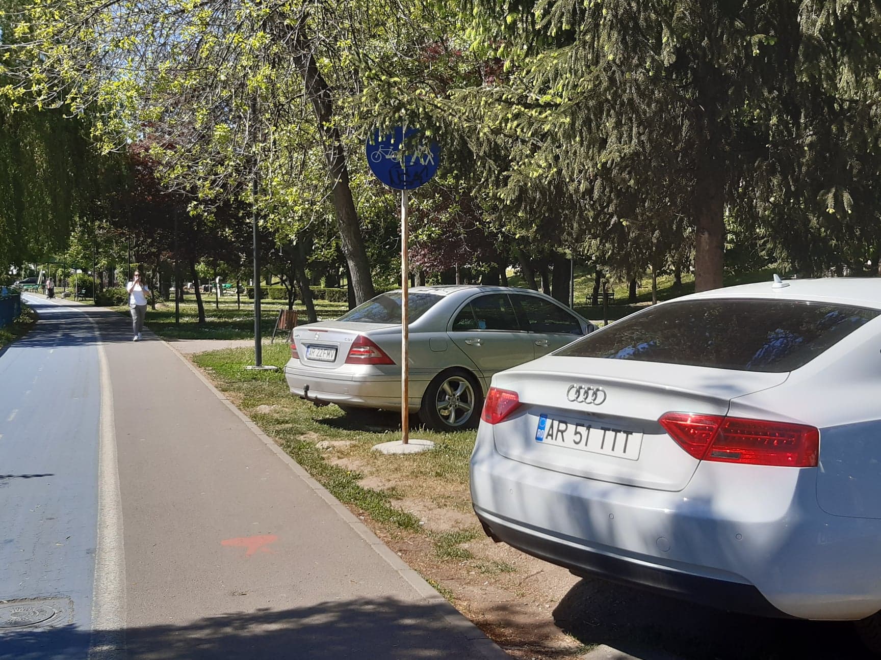 Un Audi cu numărul AR-51-TTT şi un Mercedes cu numărul AR-22-FMV au putut fi zărite, marţi, înainte de orele prânzului, parcate în toată splendoarea lor pe iarba verde din proximitatea fostului local „Perla Mureşului”. Ca şi cum ar fi fost marcate locuri de parcare pe gazon, şoferii şi-au lăsat maşinile la 45 de grade, de-o parte şi de alta a unui indicator care atenţiona asupra delimitării pistelor de biciclete şi de pietoni. Desigur, nu i-au încurcat nici pe biciclişti, nici pe pietoni, doar şi-au arătat imensul dispreţ faţă de natură.