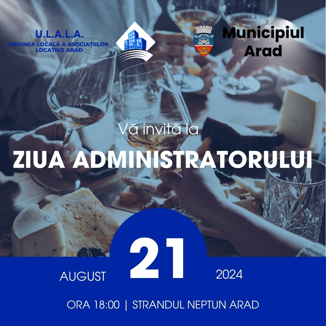 Uniunea Locală a Asociaţiilor Locative (ULAL) Arad organizează, în parteneriat cu Primăria Municipiului Arad evenimentul anual „Ziua Administratorului”. Acesta va avea loc miercuri, 21 august 2024, începând cu ora 18, la Ştrandul Neptun.