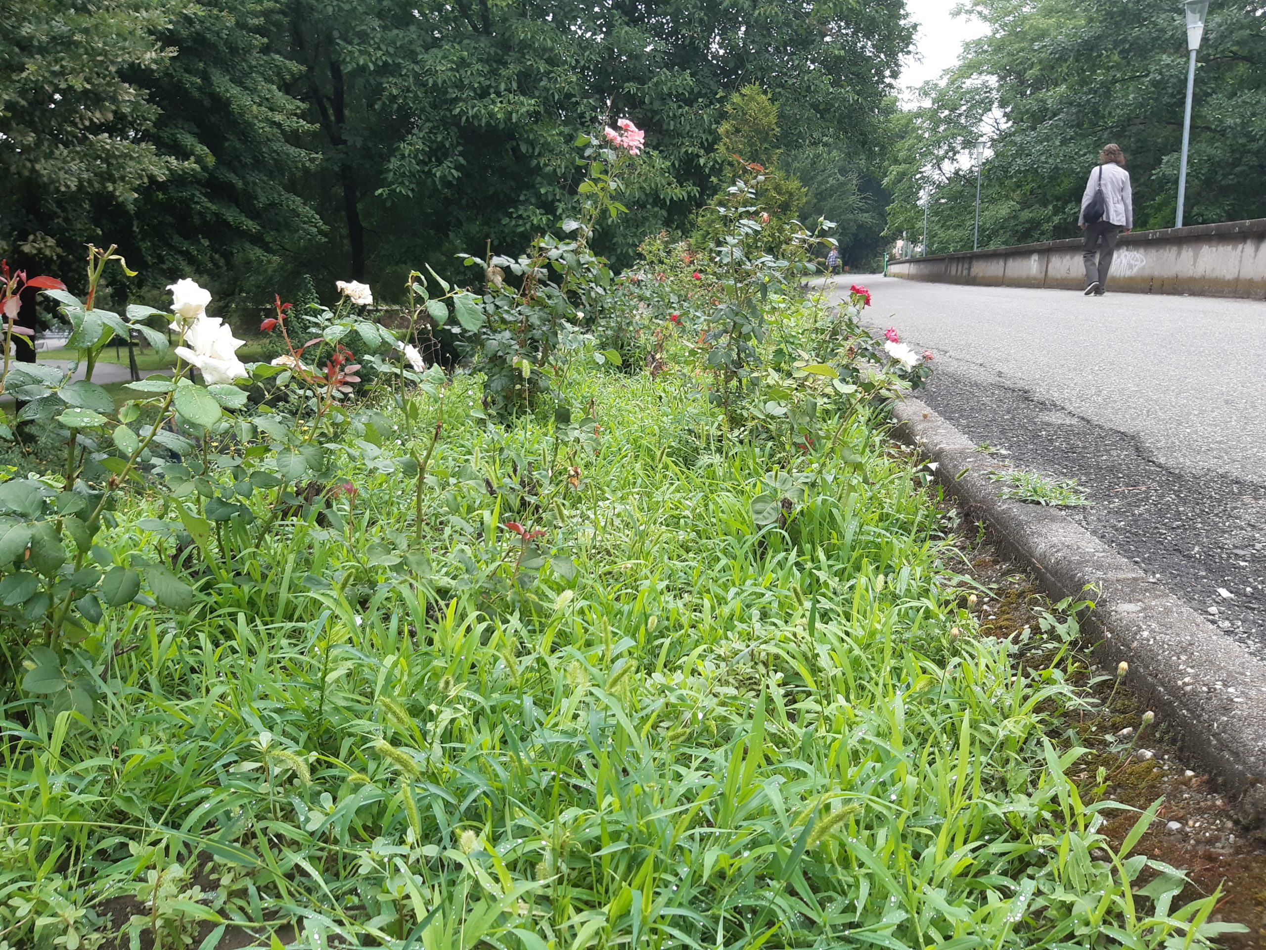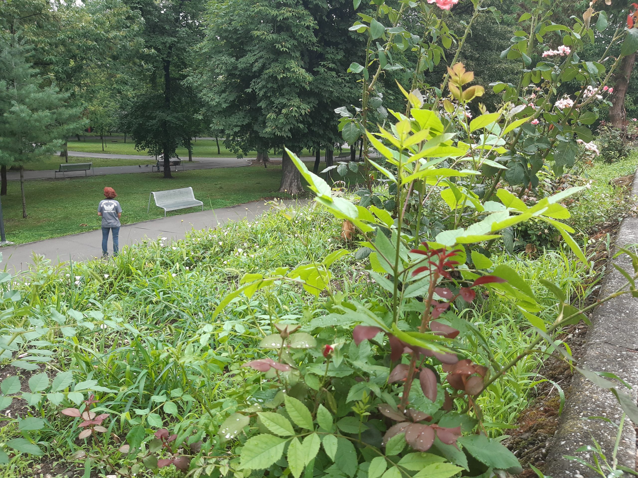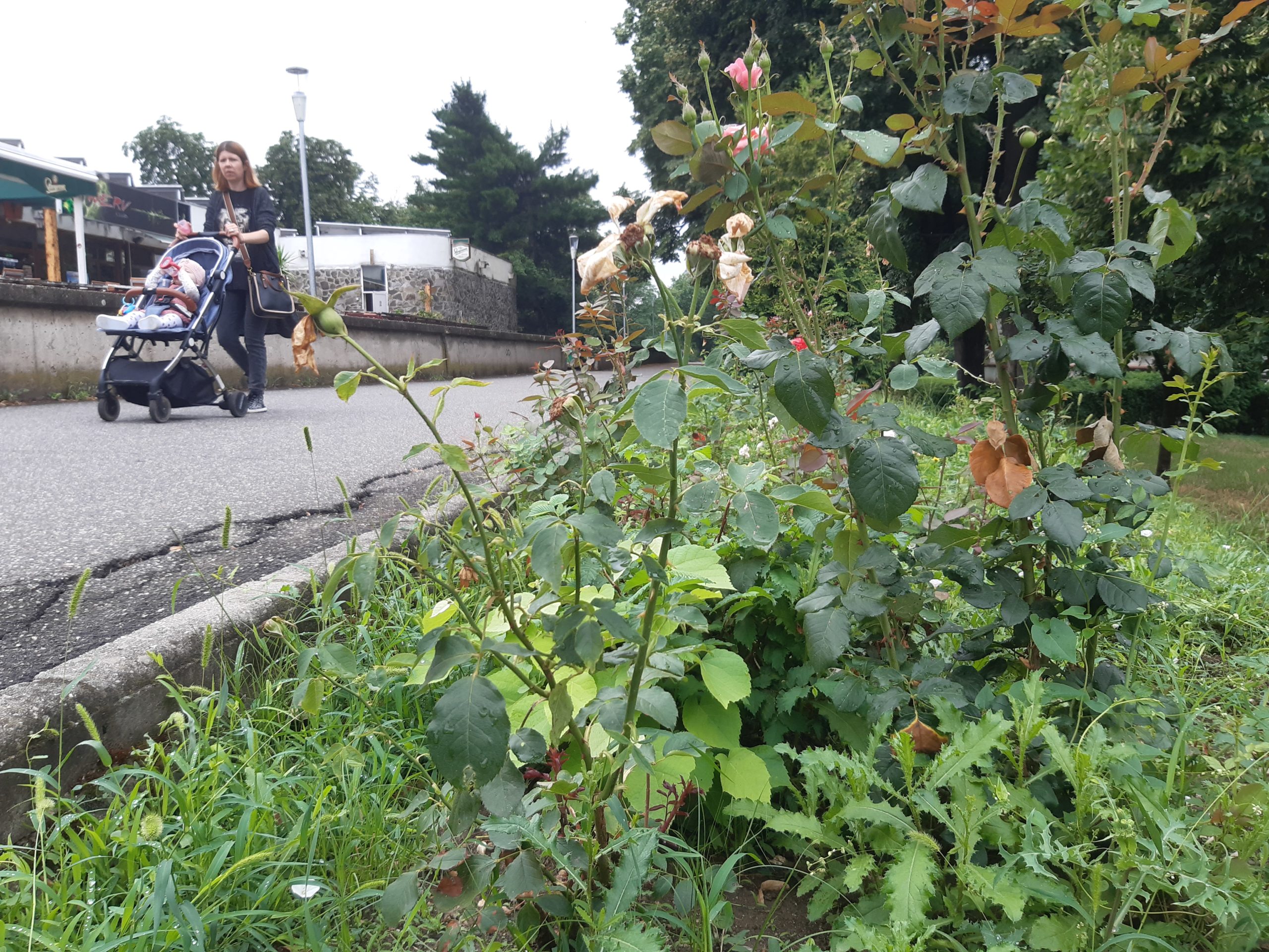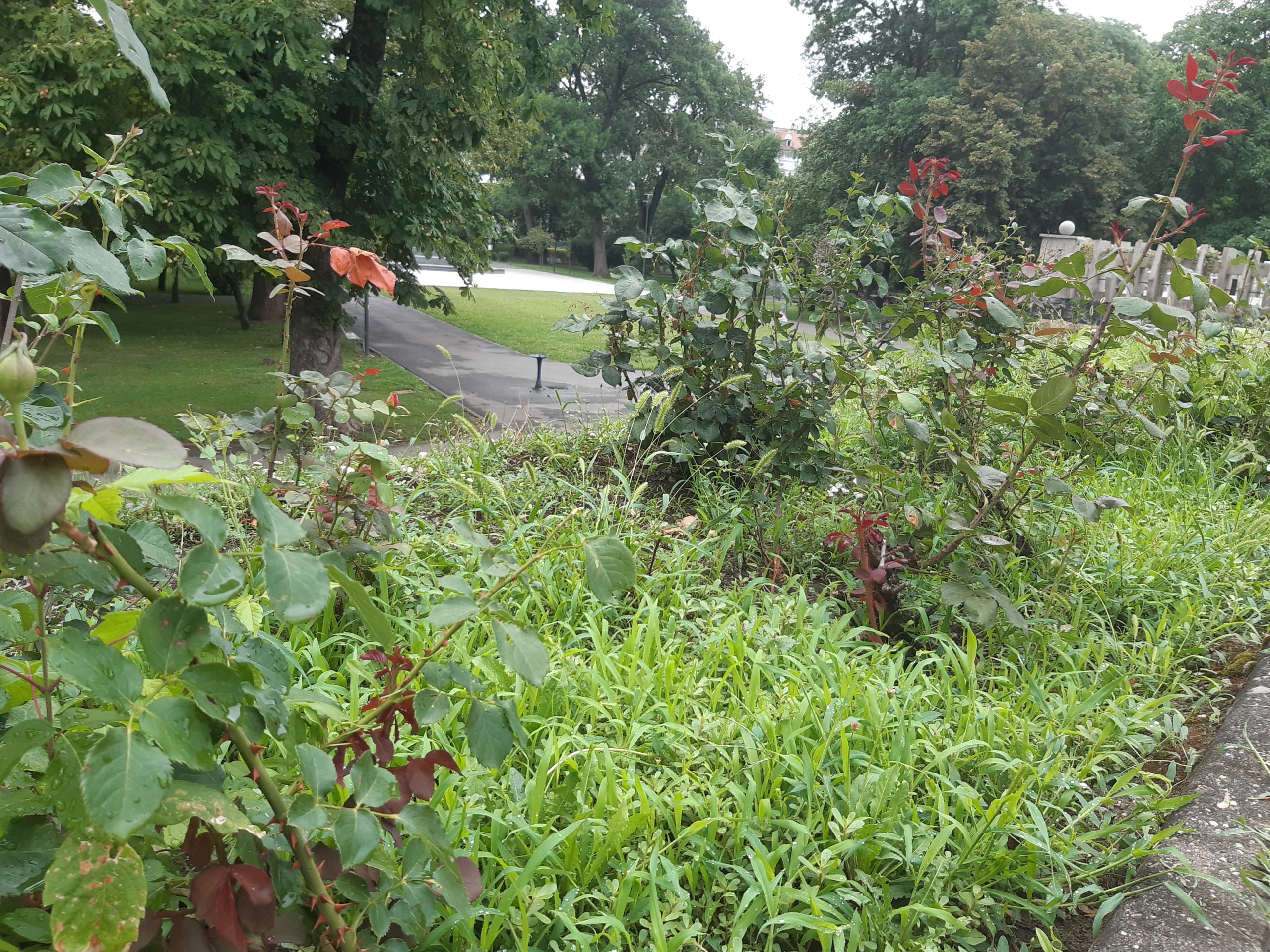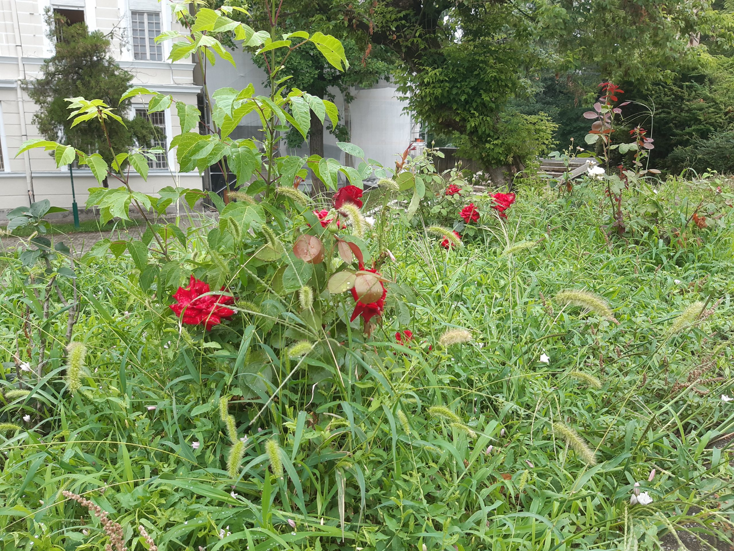Acum nu poţi decât să te întristezi. Buruienile nu au fost plivite deloc nici în acest sezon, nici în primăvară, aşa că au crescut cum şi cât „au avut chef” invadând întregul spaţiu. Trandafirii au fost împiedicaţi să se dezvolte, devenind practic acoperiţi de buruieni. Ele ar fi trebuit smulse în câteva rânduri până acum, dar grădinarii nu au fost zăriţi deloc pe aici, cu astfel de îndeletniciri (aşa cum se întâmpla în anii trecuţi). Ici-colo, printre buruieni, şi-au făcut loc şi puieţi de nuci sau alţi arbori, ca şi cum ar fi în sălbăticie…