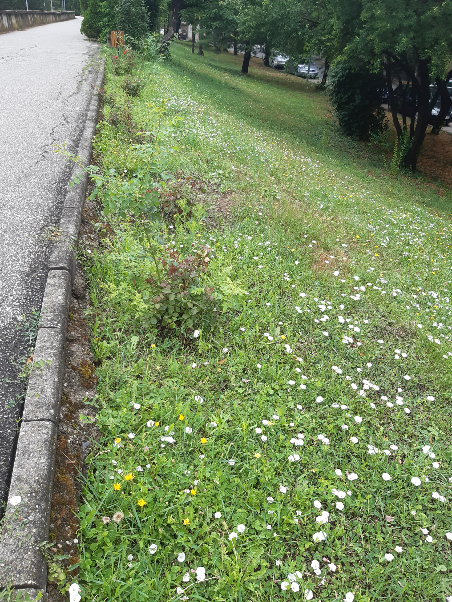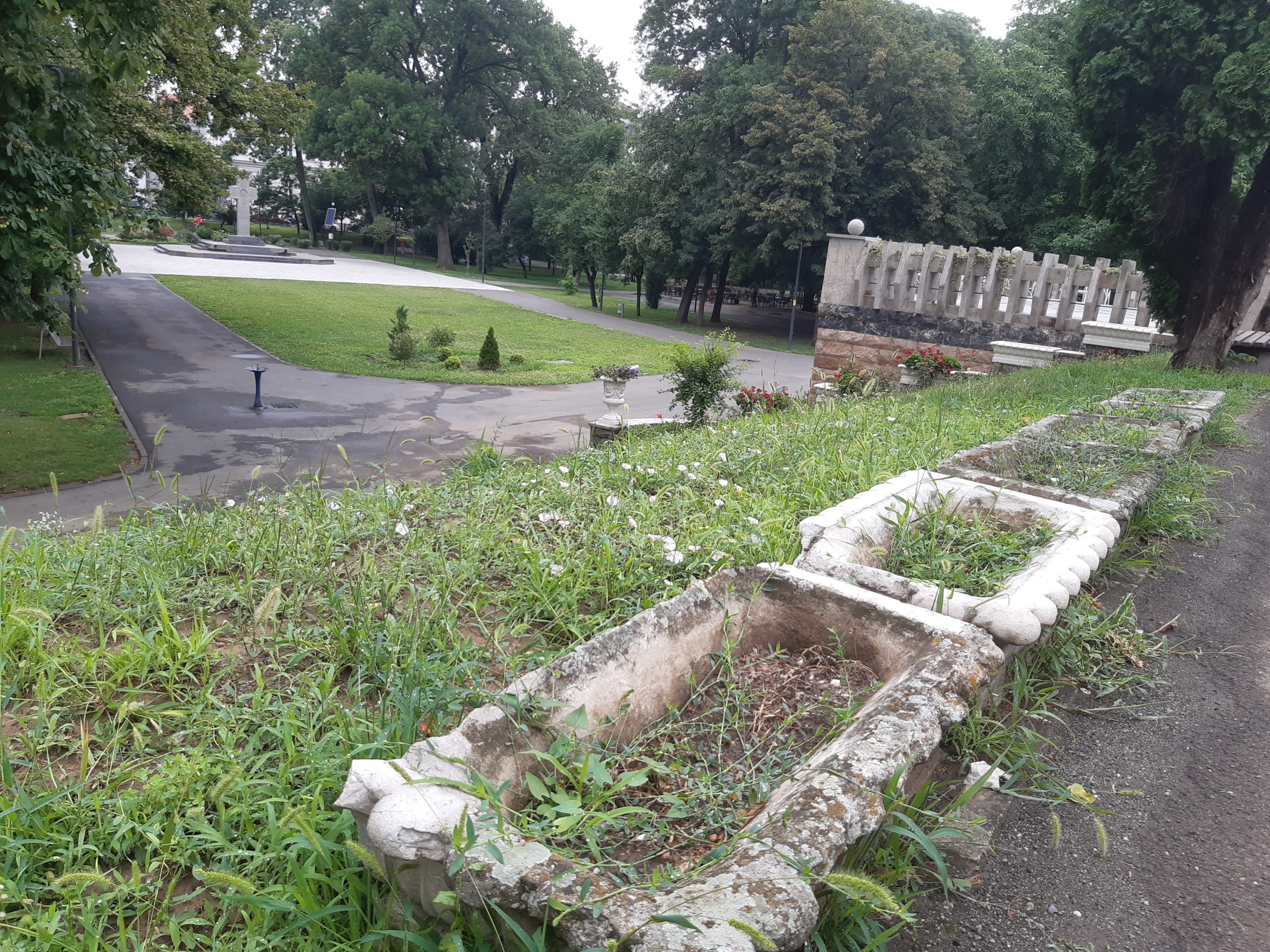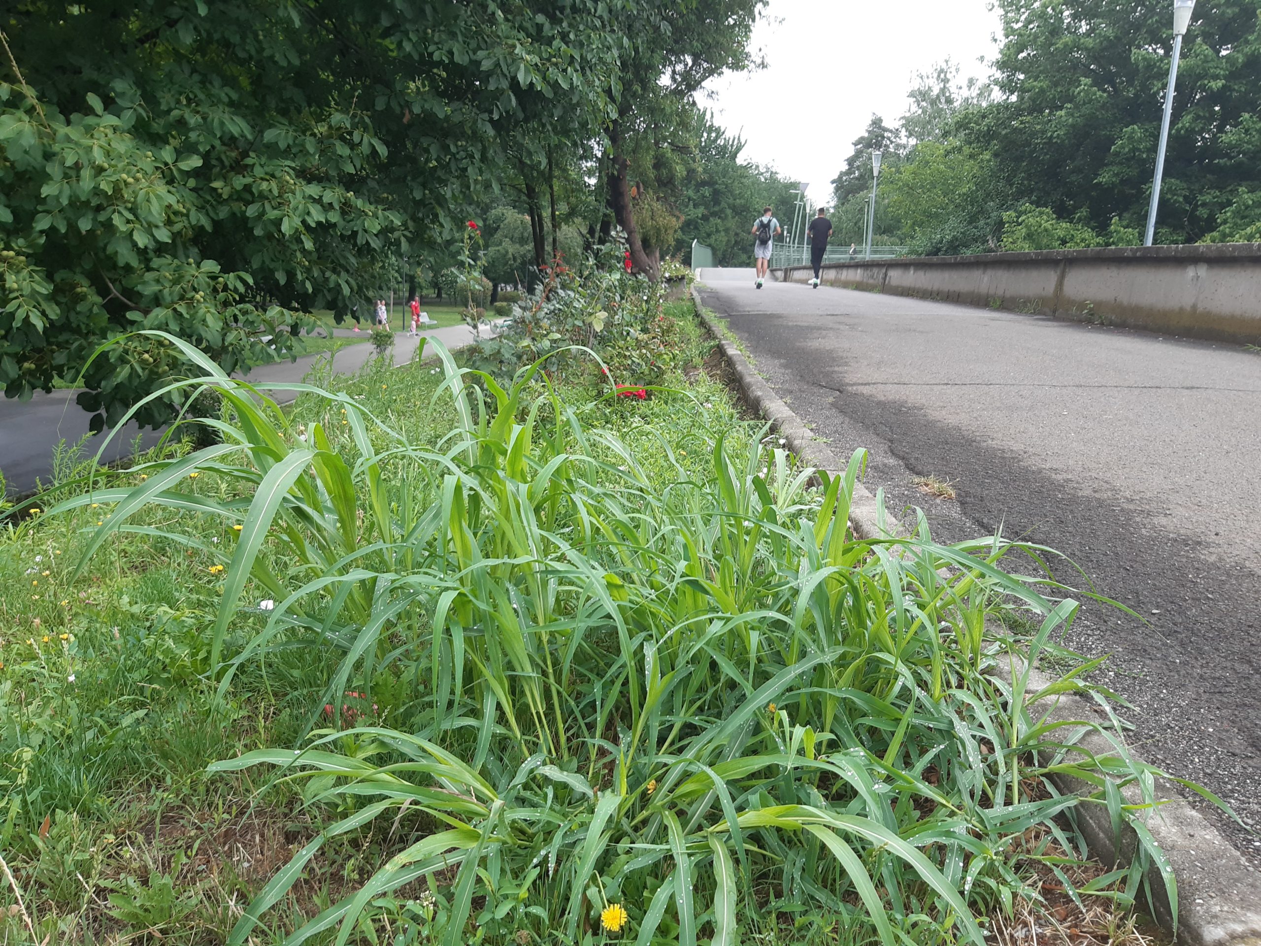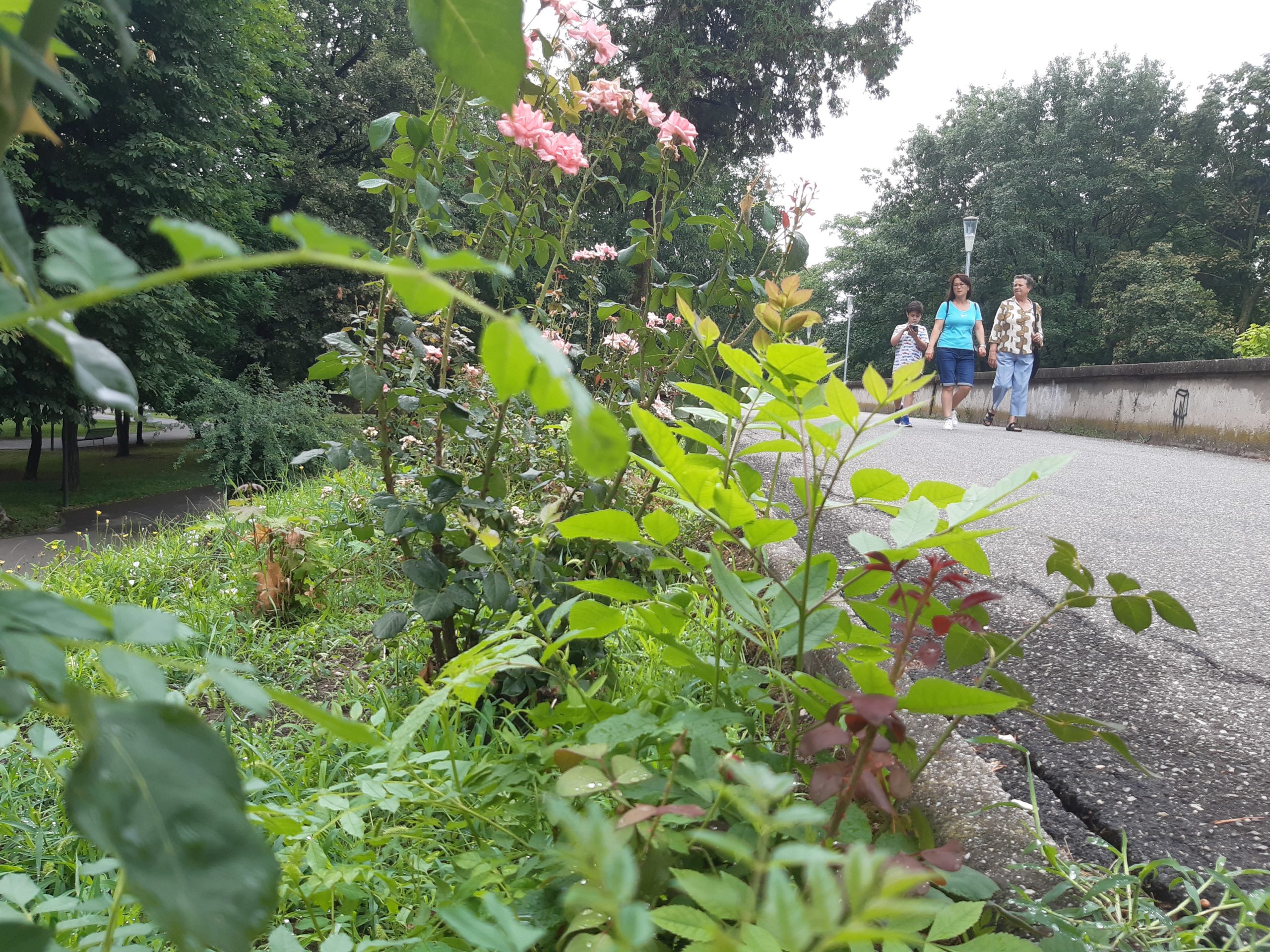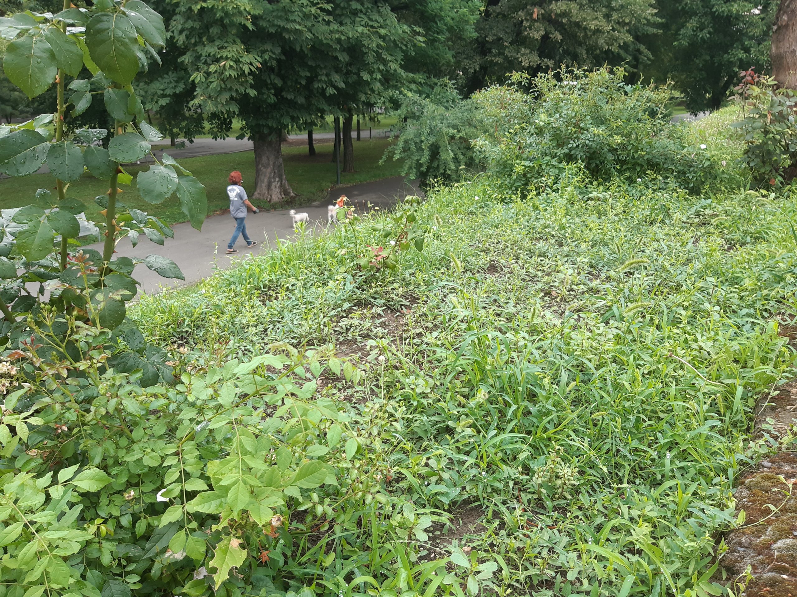 Acum nu poţi decât să te întristezi. Buruienile nu au fost plivite deloc nici în acest sezon, nici în primăvară, aşa că au crescut cum şi cât „au avut chef” invadând întregul spaţiu. Trandafirii au fost împiedicaţi să se dezvolte, devenind practic acoperiţi de buruieni. Ele ar fi trebuit smulse în câteva rânduri până acum, dar grădinarii nu au fost zăriţi deloc pe aici, cu astfel de îndeletniciri (aşa cum se întâmpla în anii trecuţi). Ici-colo, printre buruieni, şi-au făcut loc şi puieţi de nuci sau alţi arbori, ca şi cum ar fi în sălbăticie…