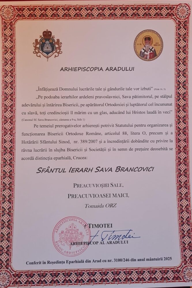 Joi, 14 august 2025, Înaltpreasfințitul Părinte Timotei, Arhiepiscopul Aradului a acordat monahiei Tomaida Orz, ostenitoare la Centrul Eparhial Arad cu o vechime de peste 25 de ani, Distincția eparhială „Crucea Sfântul Ierarh Sava Brancovici”.