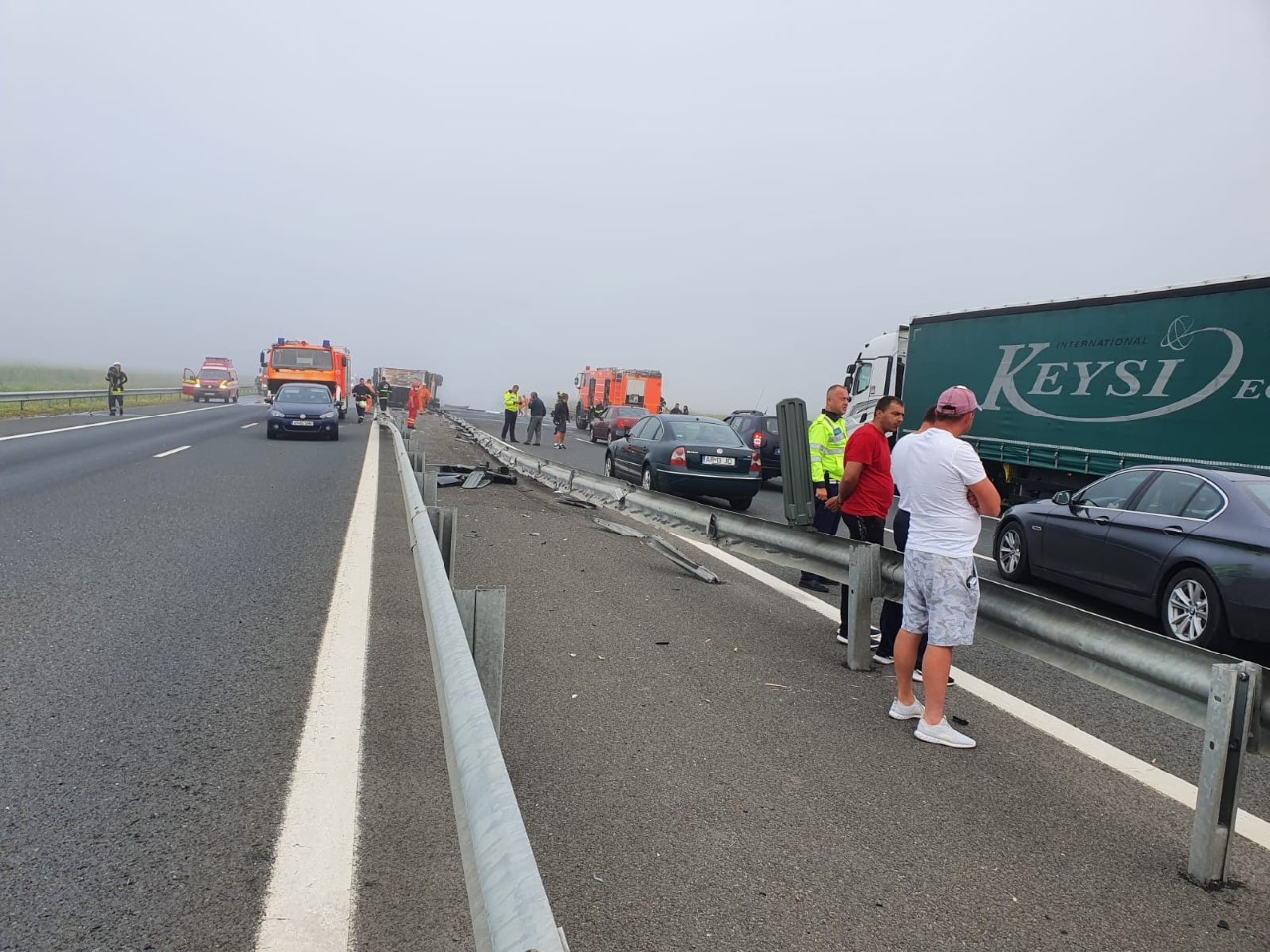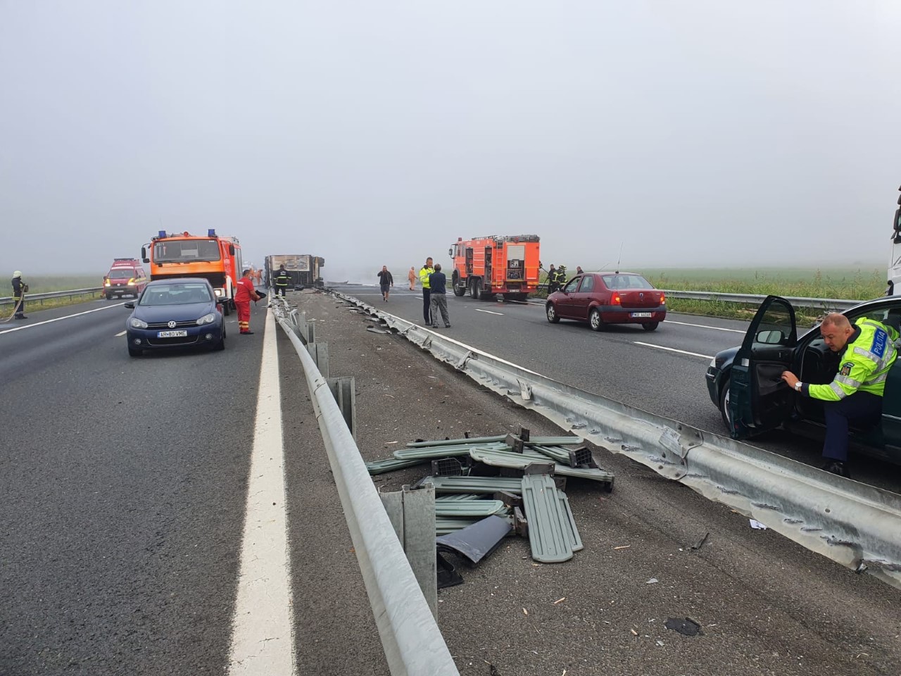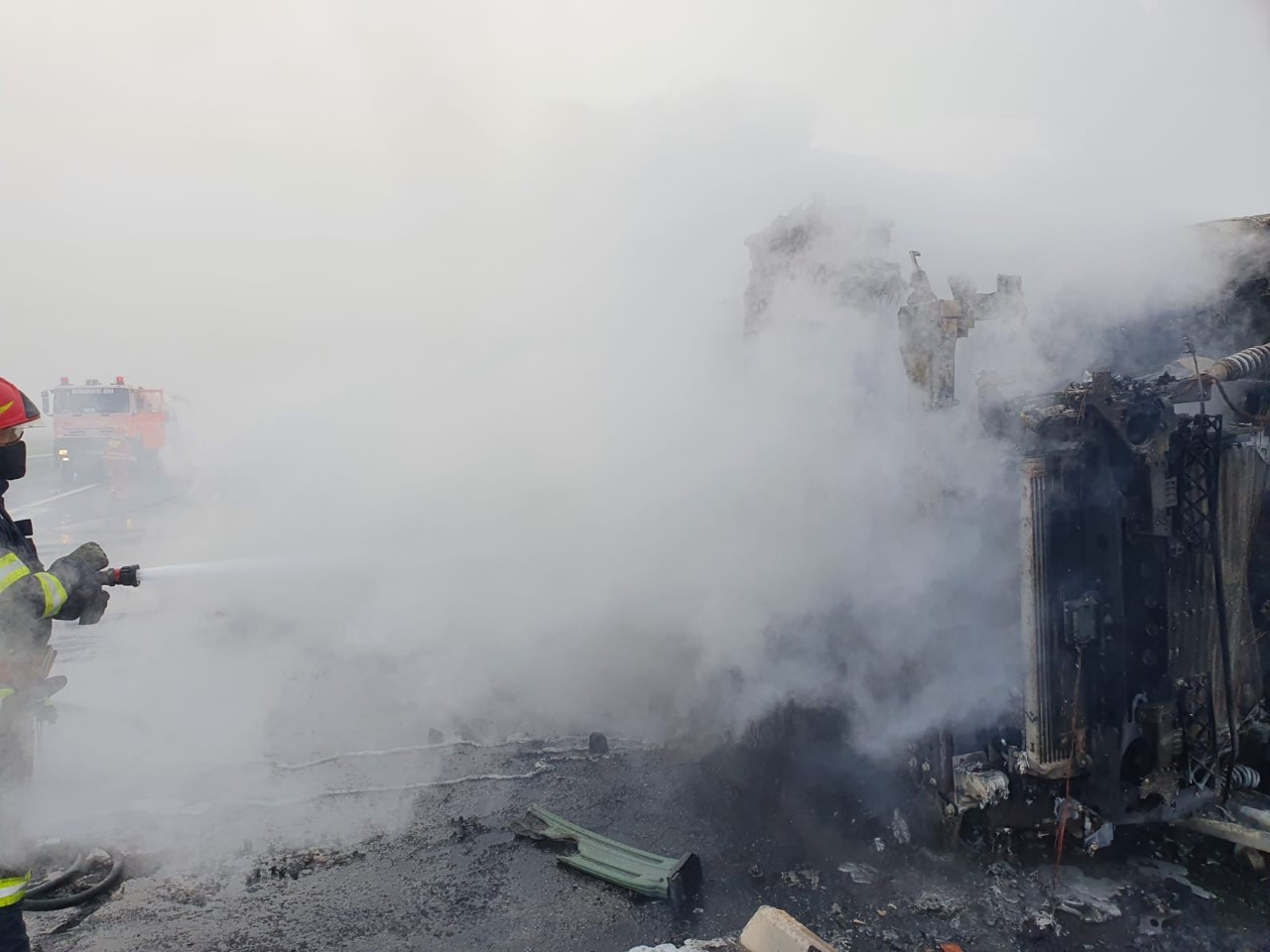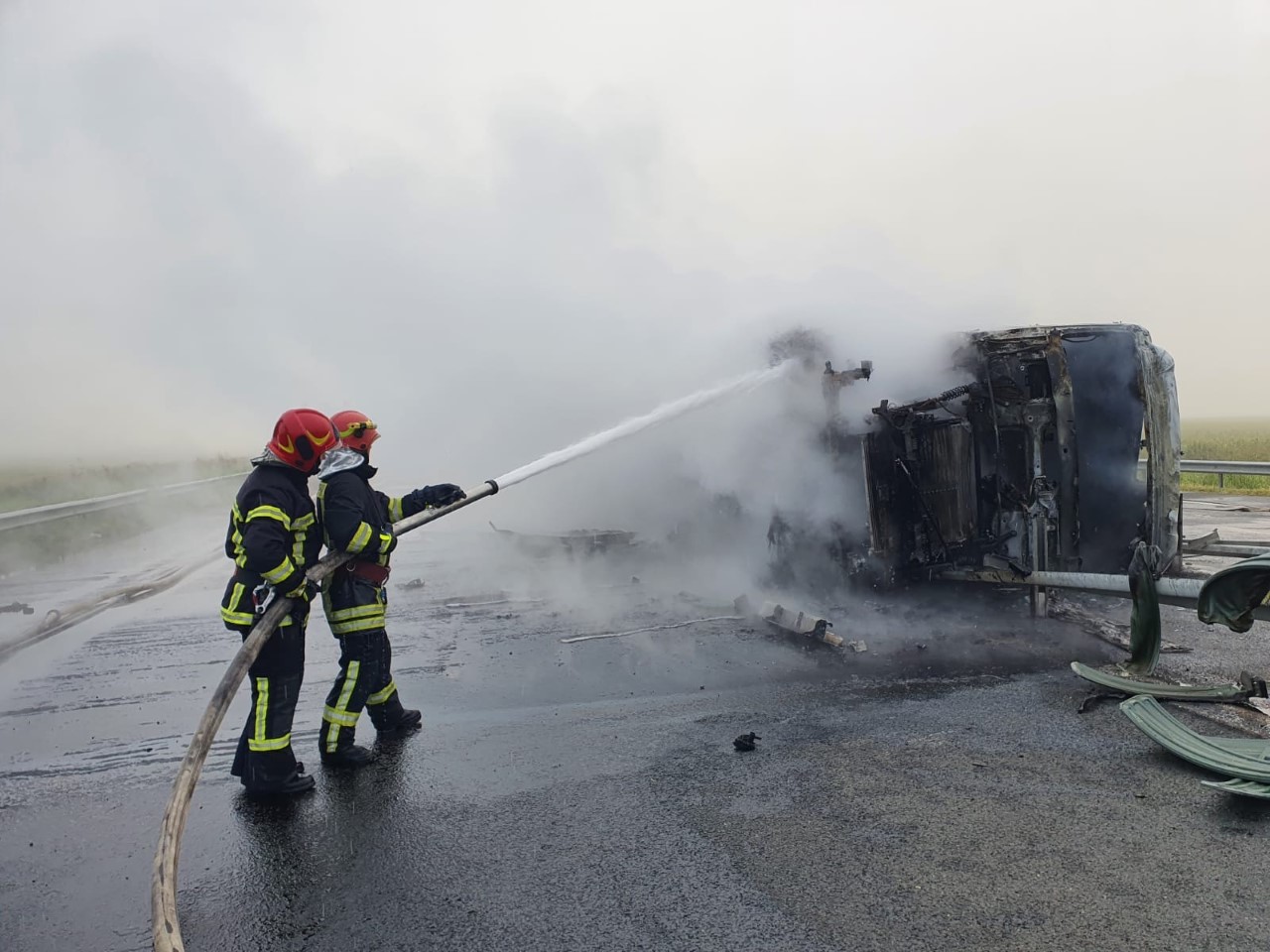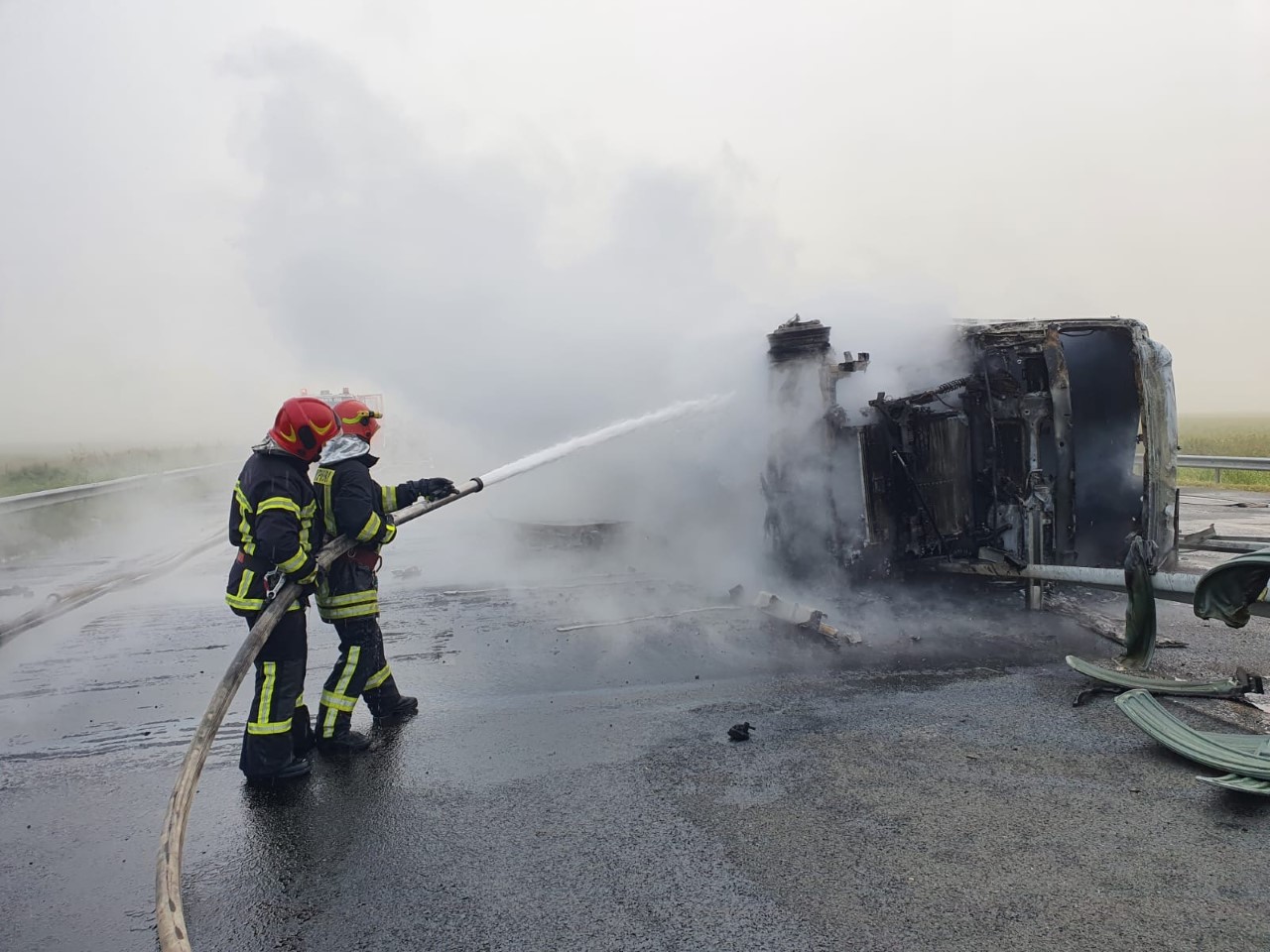 ARAD. Ambele sensuri ale autostrăzii au fost blocate în urma izbucnirii incendiului. La fața locului au intervenit două autospeciale de stingere cu apă și spumă cu opt subofițeri din cadrul Detașamentului de Pompieri Arad, o autospecială cu cinci pompieri voluntari și SMURD Nădlac.