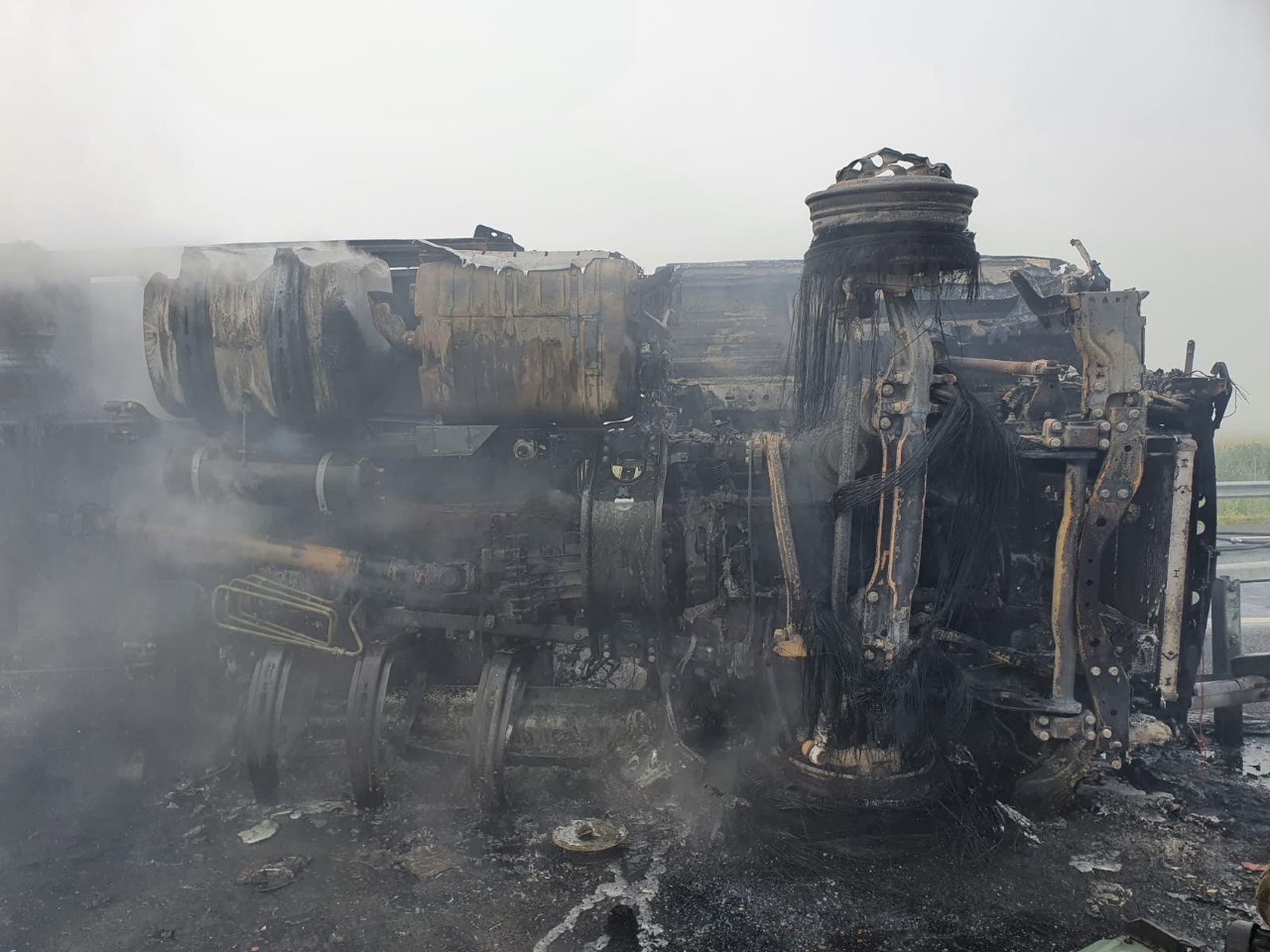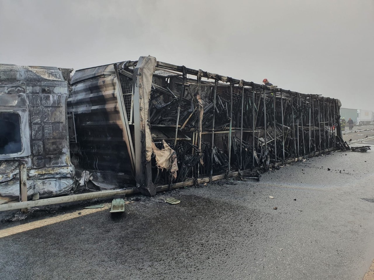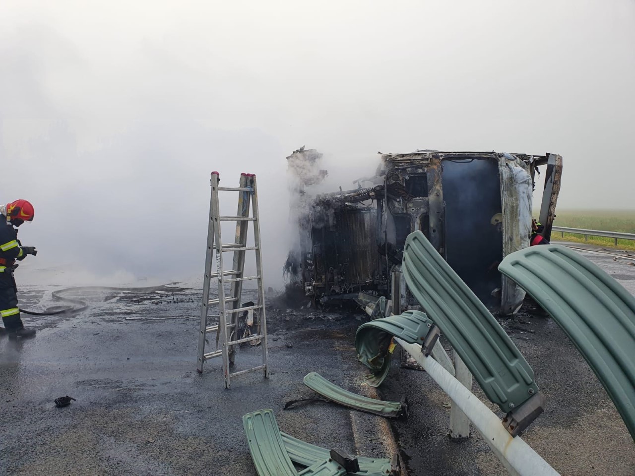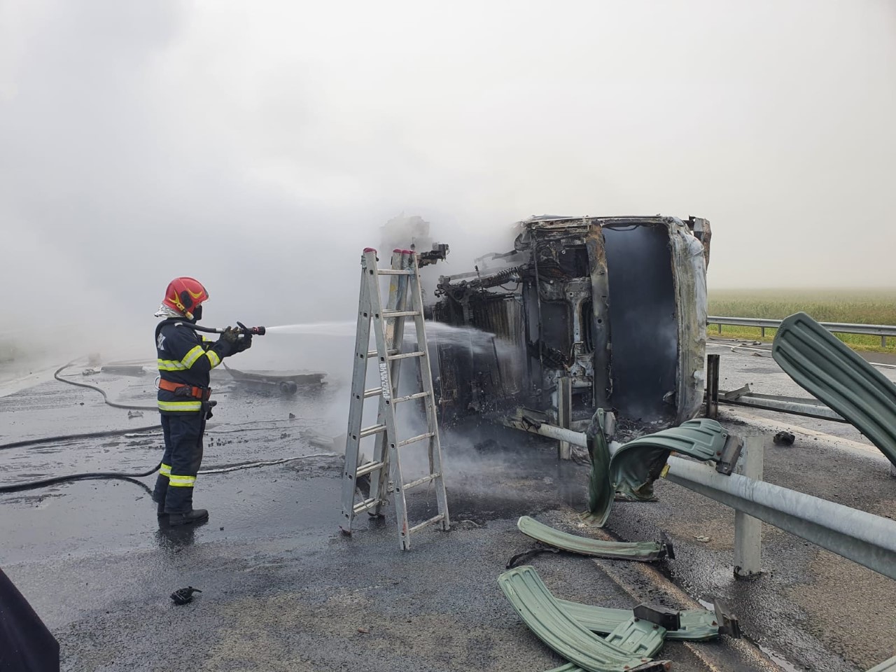 UPDATE: Înainte de a fi cuprins de flăcări, camionul – care se îndrepta spre Nădlac, pe autostradă – a acroşat două autotrenuri oprite pe banda de urgenţă în coloană pentru controlul de frontieră. În urma impactului, automarfarul – încărcat cu piese auto – s-a răsturnat pe zona mediană a autostrăzii şi a luat foc.