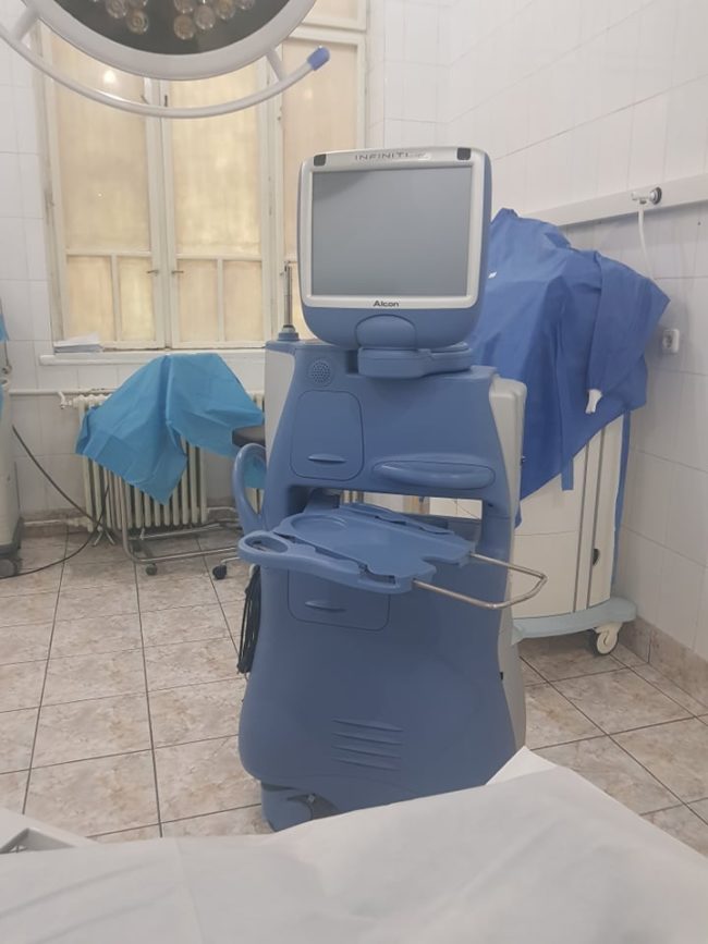 Aparat de tomografie oculară computerizată (OCT), ecograf oftalmologic, trei biomicroscoape oftalmologice, două tonometre cu rebound, un aplanotonometru, un autokeratorefractometru, un biometru oftalmologic, un câmp vizual computerizat, unul manual și un optotip, microscop operator oftalmologic, aparat de facoemulsificare, lampă scialitică, masă de operație, aparat de sterilizare și instrumentar de macro și micro-chirurgie oftalmologică. Toate acestea fac parte din dotarea Compartimentului de Oftalmologie al Spitalului Clinic Județean de Urgență Arad.