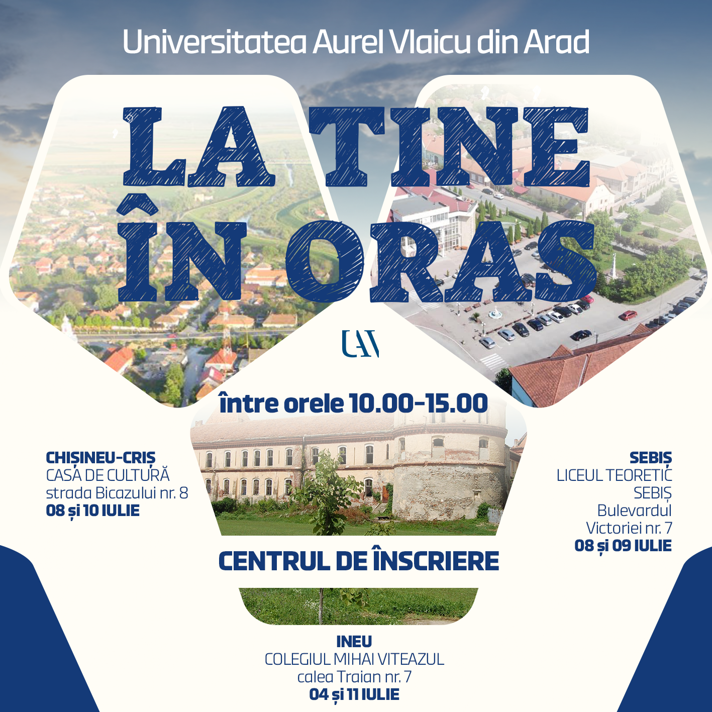 În fiecare centru, reprezentanții universității vor face înscrieri pentru oricare din cele 9 facultăți, între orele 10.00-15.00, conform următorului calendar: la Chișineu Criș echipa UAV va fi prezentă în 8 și 10 iulie, la Casa de Cultură (str. Bicazului nr.8), la Ineu în 4 și 11 iulie, la Colegiul „ Mihai Viteazul” (Calea Traian nr 7), între orele 10:00 și 15:00, Sebiș în 8 si 9 iulie, la Liceul Teoretic Sebiș (Bulevardul Victoriei, nr. 7).