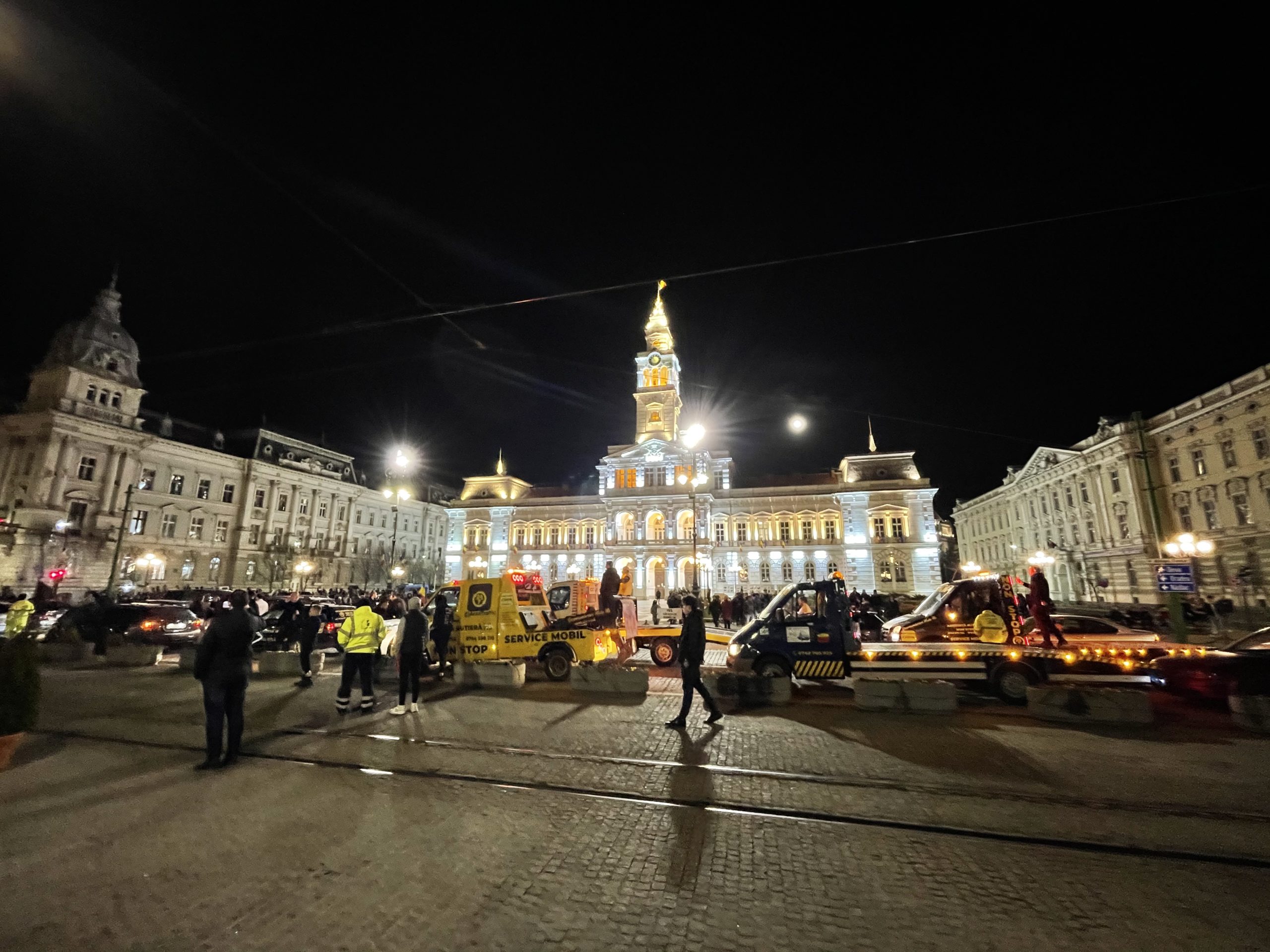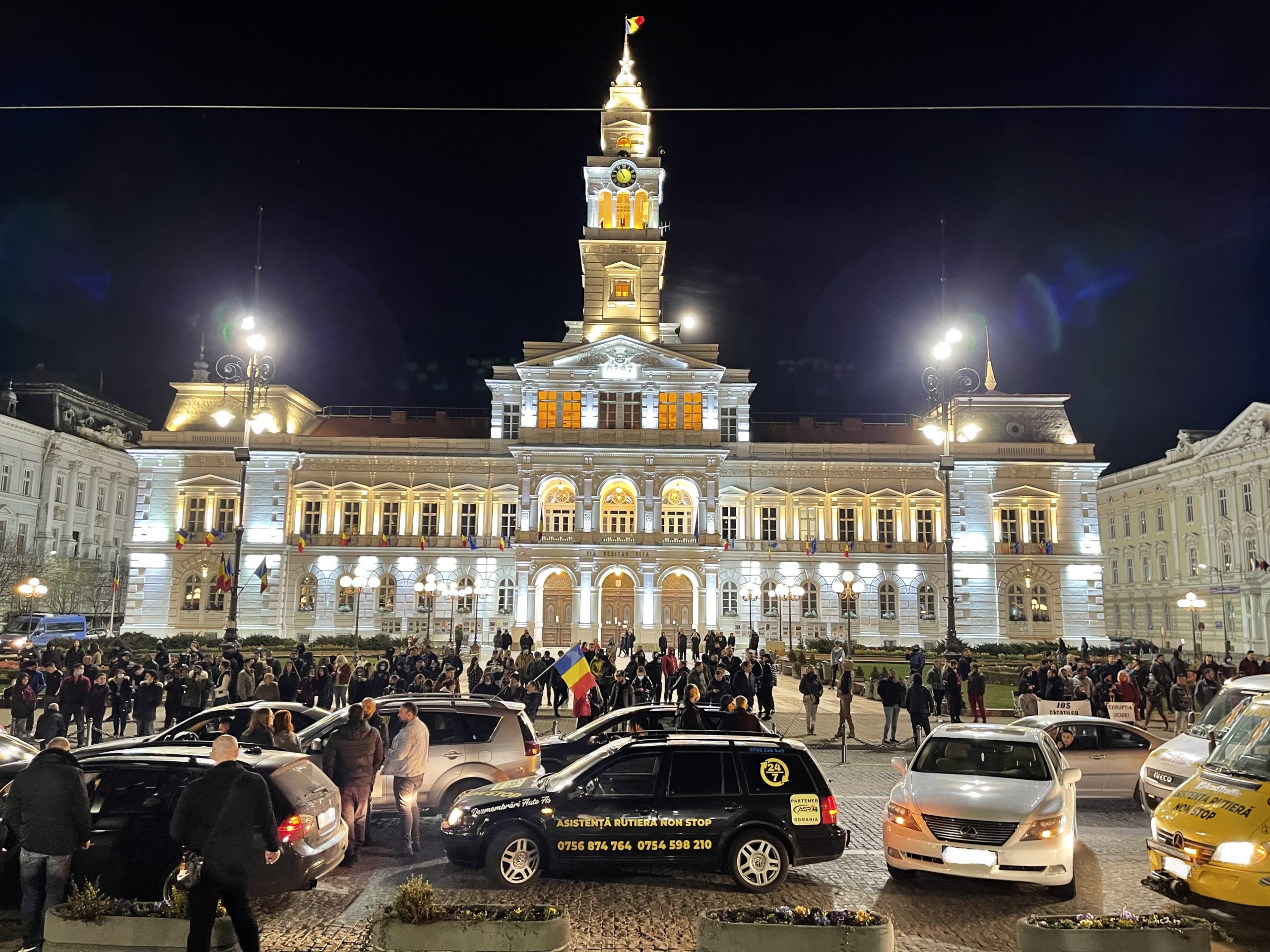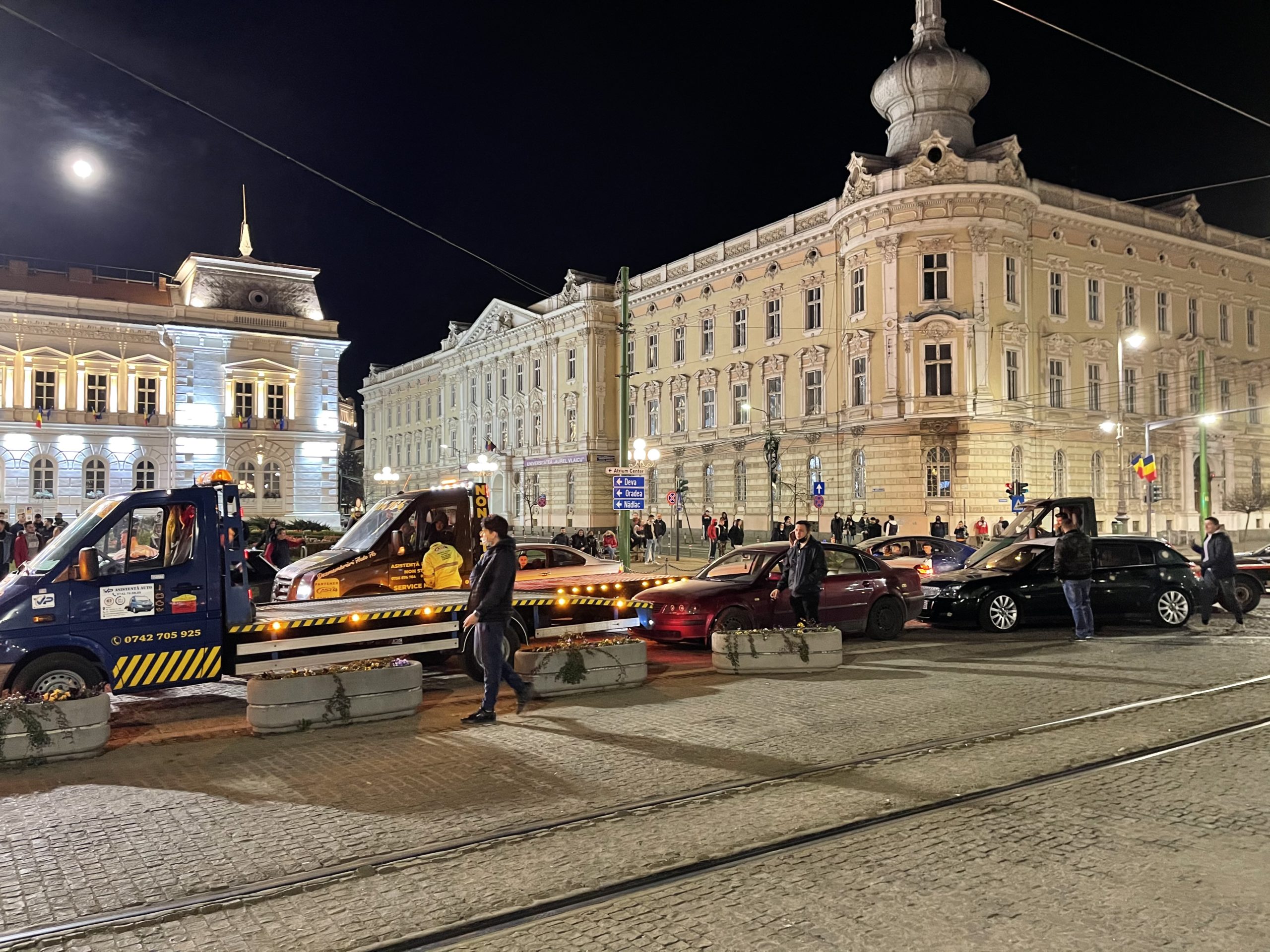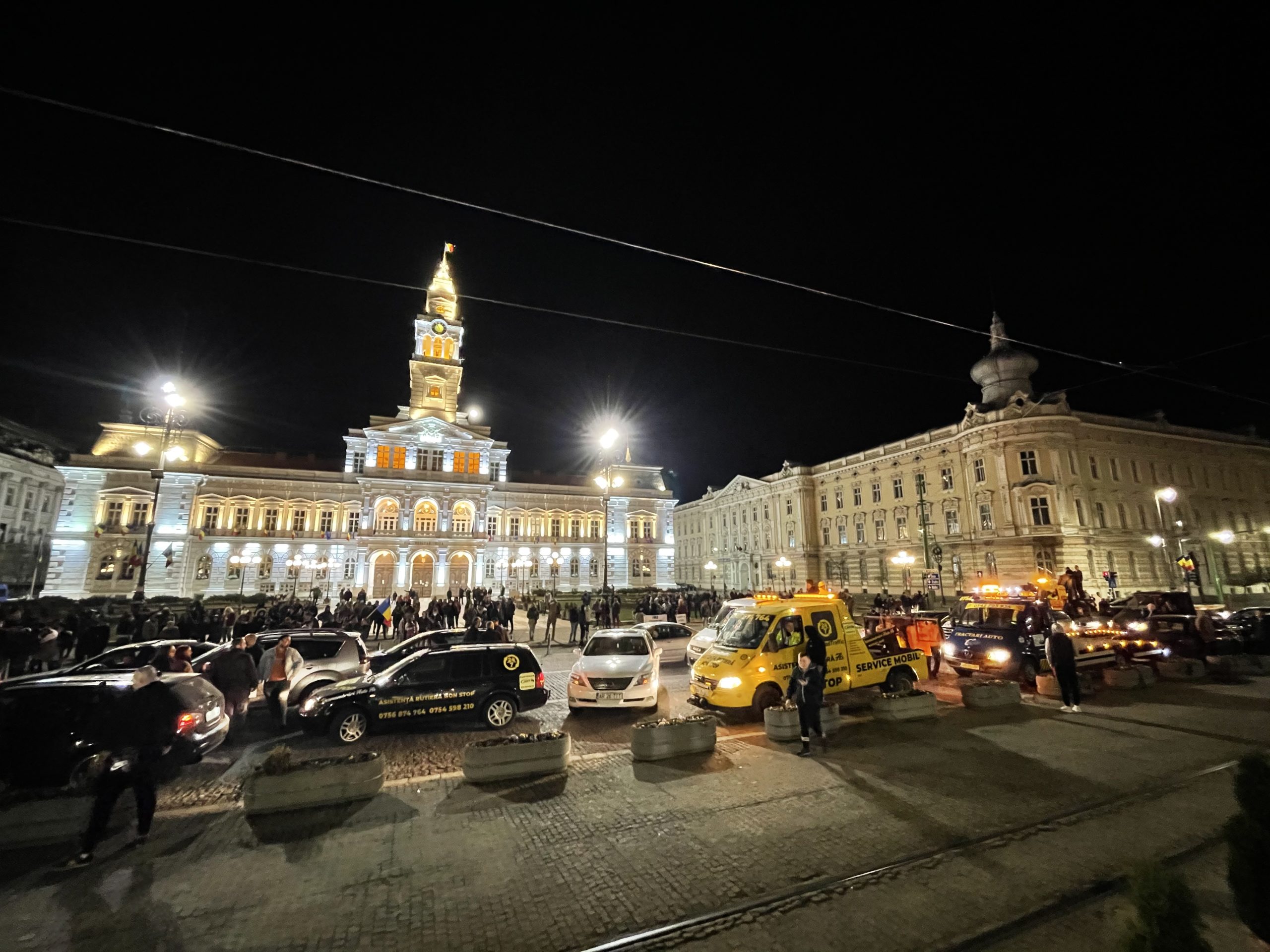 În jurul orei 23:00, zeci de mașini și motociclete au blocat, din nou, centrul municipiului, în fața Primăriei, și s-a făcut spectacol.