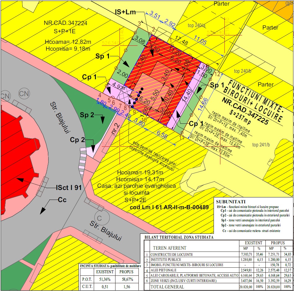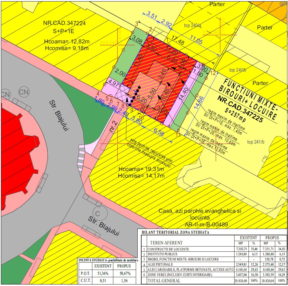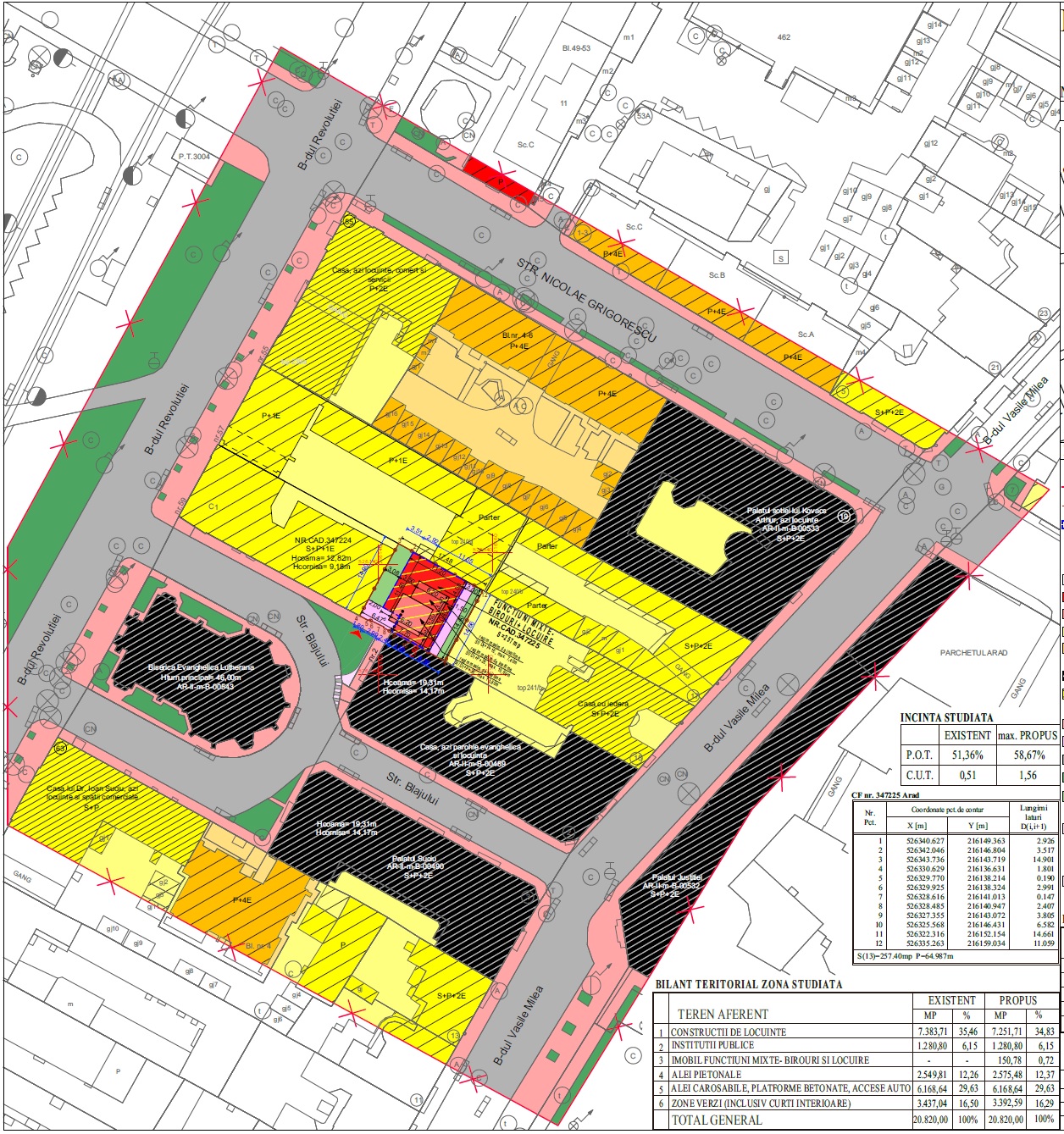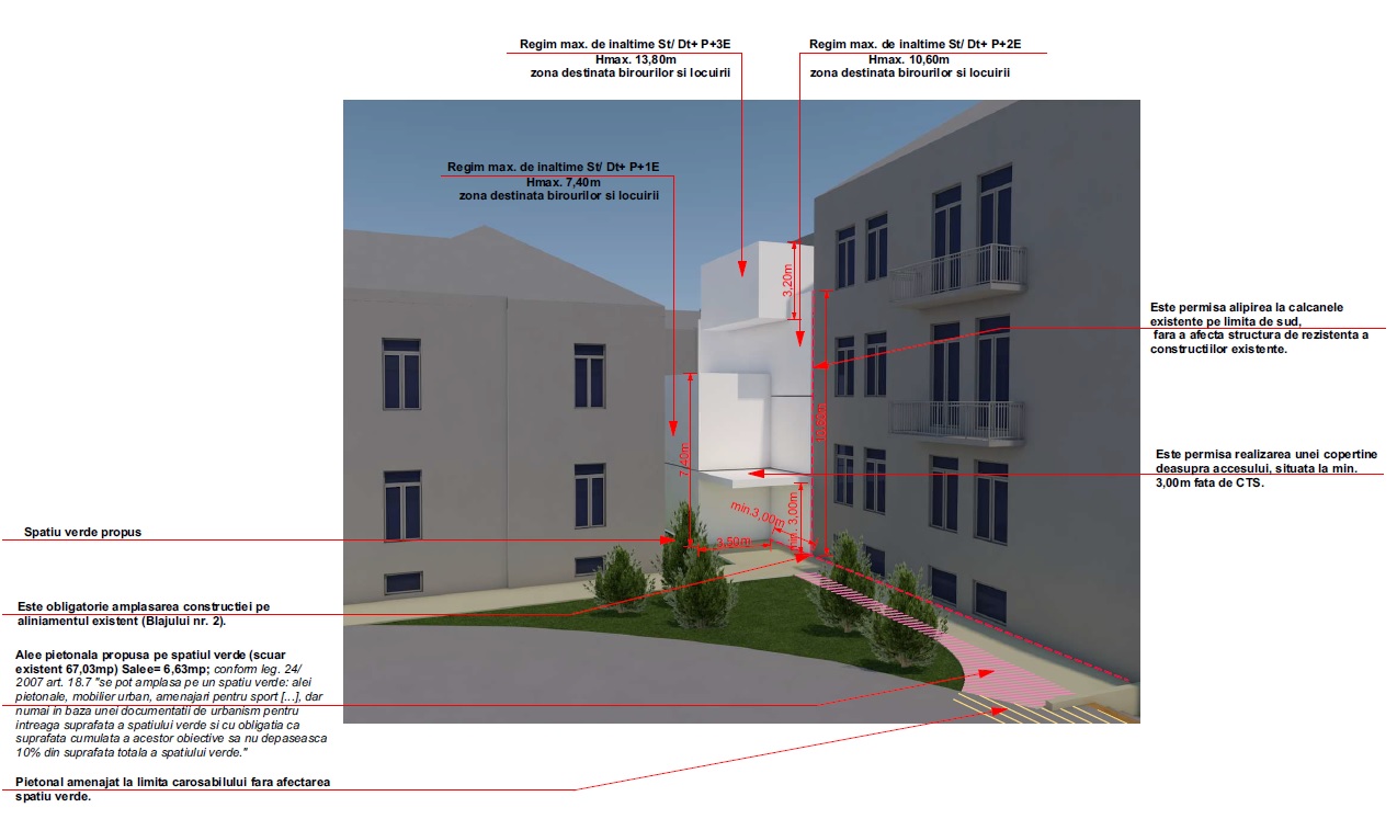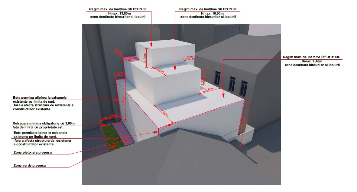 Investitorul doreşte schimbarea destinației parcelei în zonă de birouri şi locuire. Imobilul propus, având funcțiuni mixte, va fi împărțit și dispus pe niveluri separate: *Subsol tehnic sau Demisol tehnic – zonă destinată funcțiunilor tehnice; *Parter şi Etaj 1 – zonă de lobby/ recepție, zonă destinată birourilor (număr estimat de 15 angajați); *Etaj 2-3 – zonă destinată locuirii -1 apartament dispus pe 2 niveluri. Înălțimea maximă a clădirii este de 13,80 metri. Regimul de înălțime va fi în trepte: vor fi zone cu înălțime maximă de 7,40 metri, 10,60 metri, respectiv 13,80 metri.
