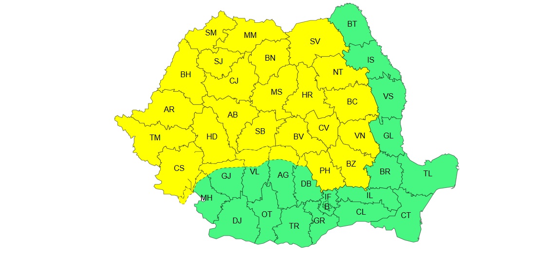 Potrivit meteorologilor, joi, între orele 10:00 – 23:00, va fi în vigoare un prim Cod galben de averse torențiale, descărcări electrice și intensificări de scurtă durată ale vântului (rafale de 50 – 70 km/h) la munte, în Crișana, Banat, Maramureș, Transilvania, vestul Moldovei și local în nordul Munteniei. În intervale scurte de timp sau prin acumulare, cantitățile de apă vor fi de 15 – 25 l/mp și pe arii restrânse de 30 – 40 l/mp. După-amiaza și seara, pe alocuri vor fi vijelii și grindină.