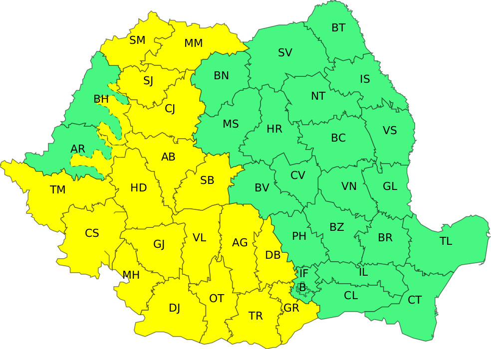 Judeţele vizate de prima atenţionare Cod galben sunt: Vâlcea, Olt, Dolj, Gorj, Mehedinţi, Caraş-Severin, Hunedoara, Timiş şi Arad.